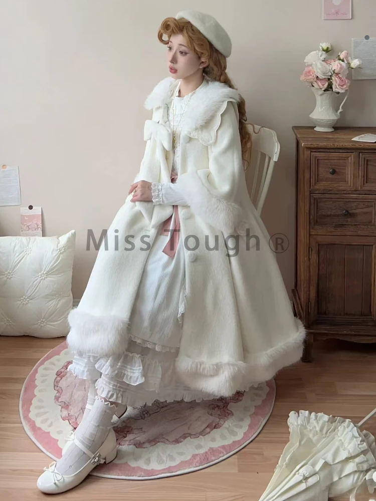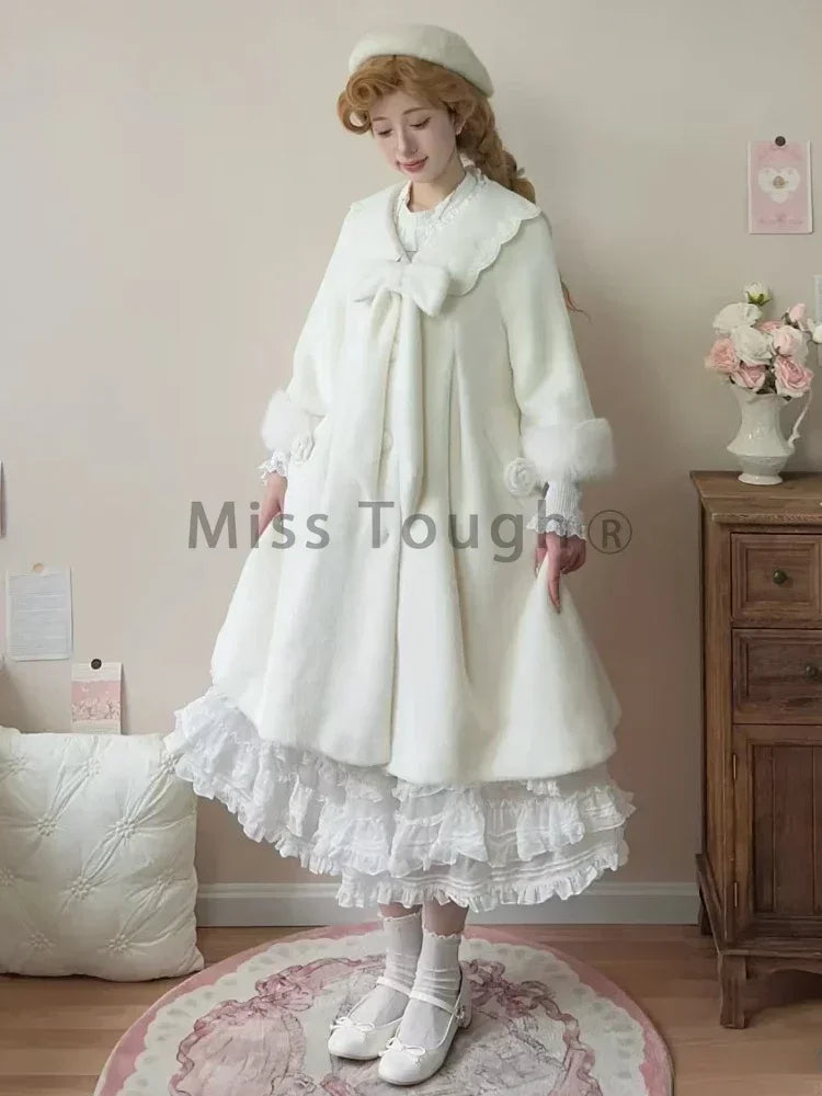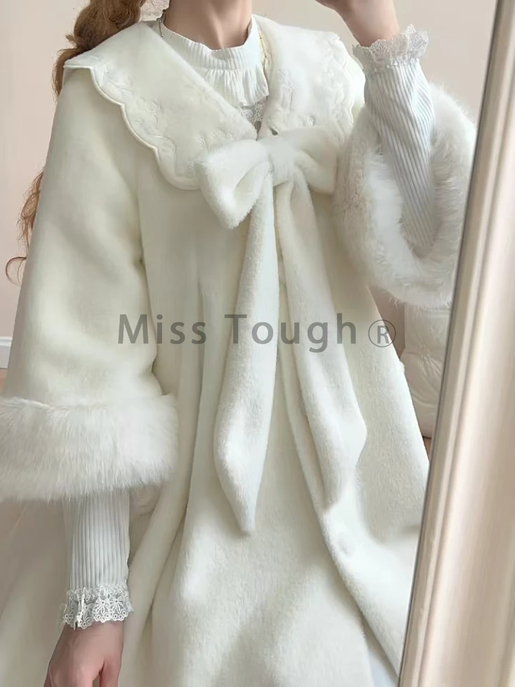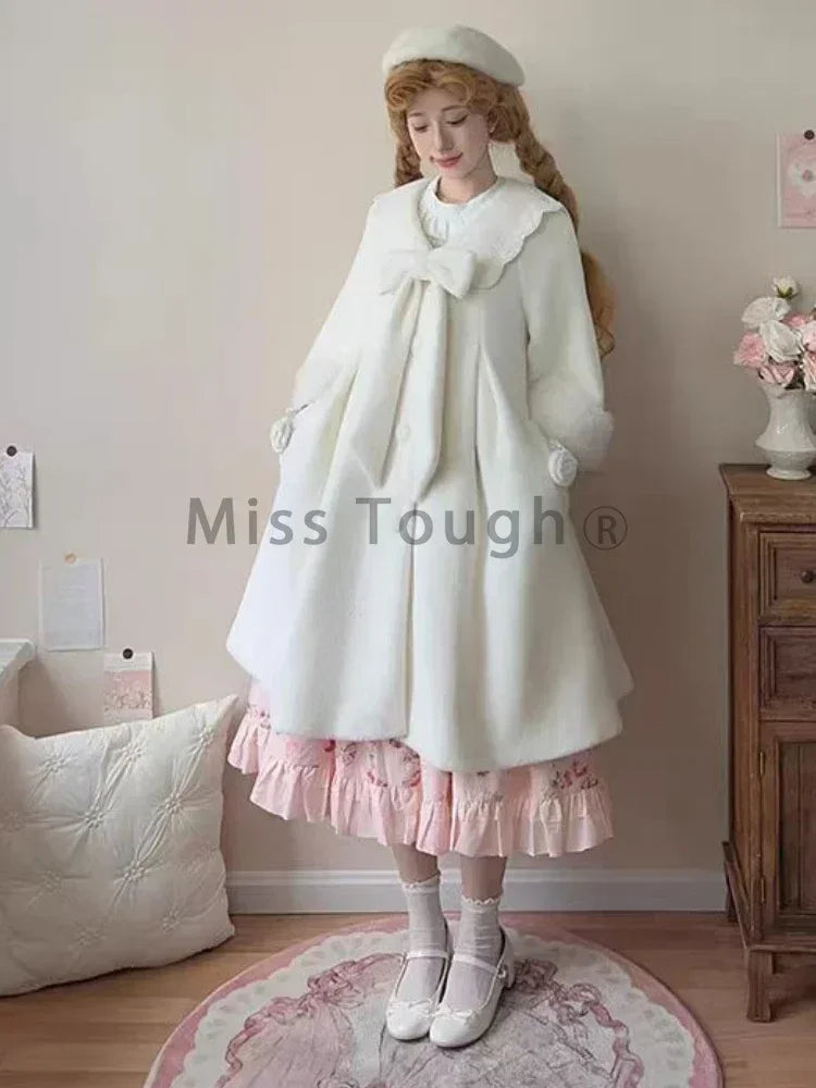 DERMEARNE Winter Sweet Fashion Solid Long Style Overcoat Women Design Kawaii Bow Long Sleeve Coat Female High Street Lolita Warm Overcoat