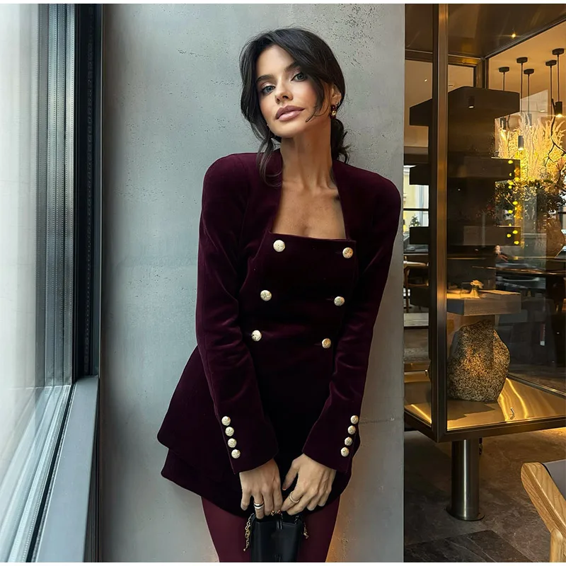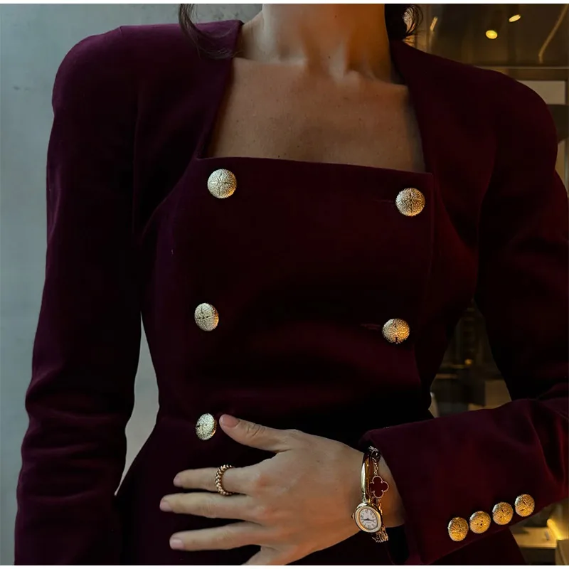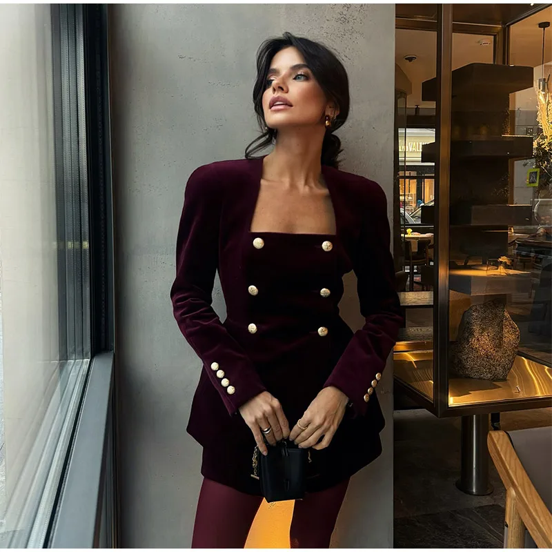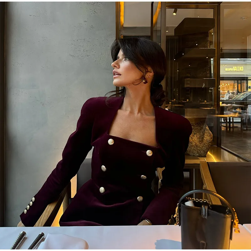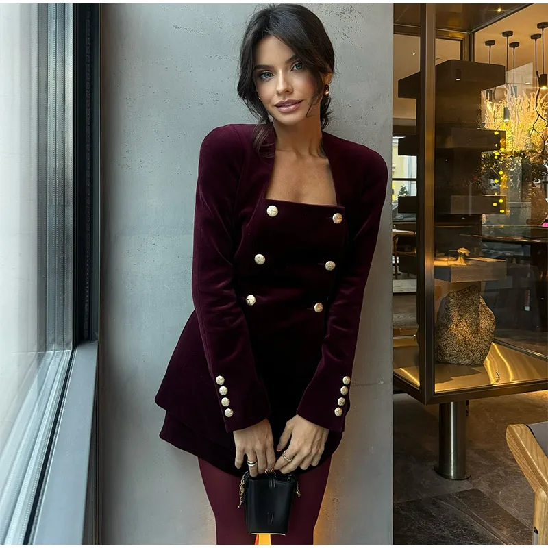 DERMEARNE Women Burgundy Velvet Mini Skirt Set Fashion Square Neck Long Sleeves Buttons Tops Skirts 2pcs Suit 2025 New Lady Party Gown