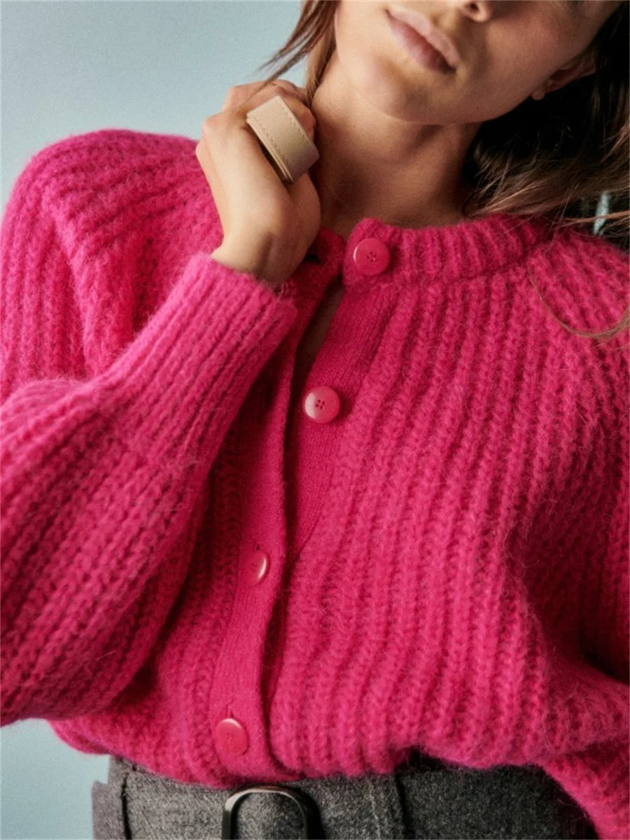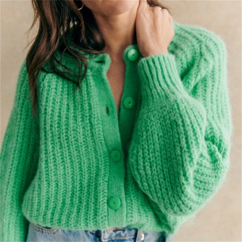 DERMEARNE Women Chunky Knit Cardigan Y2k Long Latern Sleeve Crew Neck Button Up Open Front Cable Knitted Short Sweater Vintage Streetwear