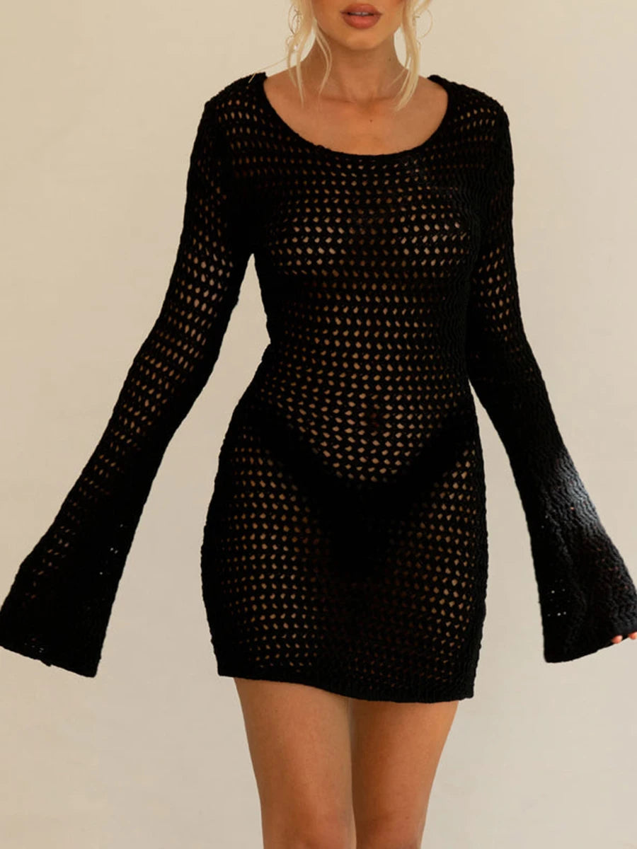 DERMEARNE Women Crochet Knit Short Dress Hollow Out Backless Summer Beach Cover Up Dress Bikini Swimsuit Swimwear