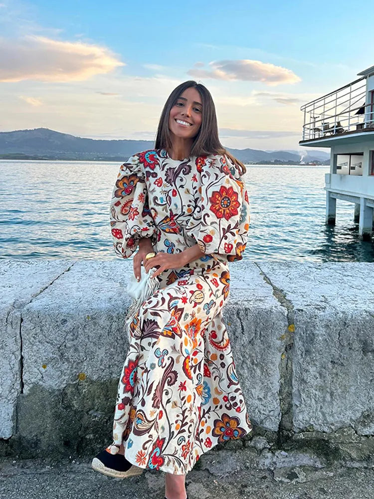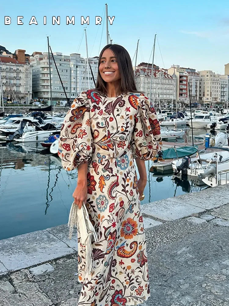 DERMEARNE Women Floral Print Boho Maxi Dress Ethnic Style O Neck Half Puff Sleeve Oversize Vestidos 2025 Casual Beach Holiday Long Robe
