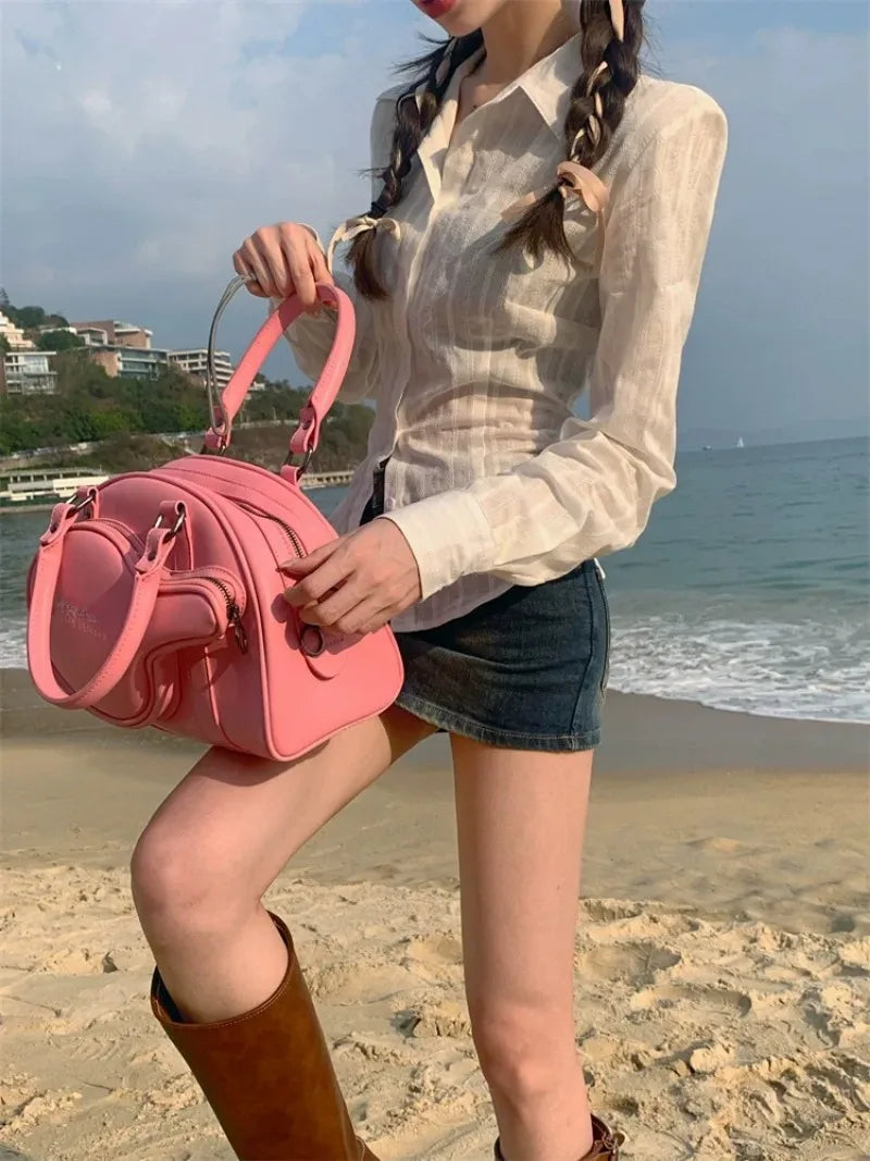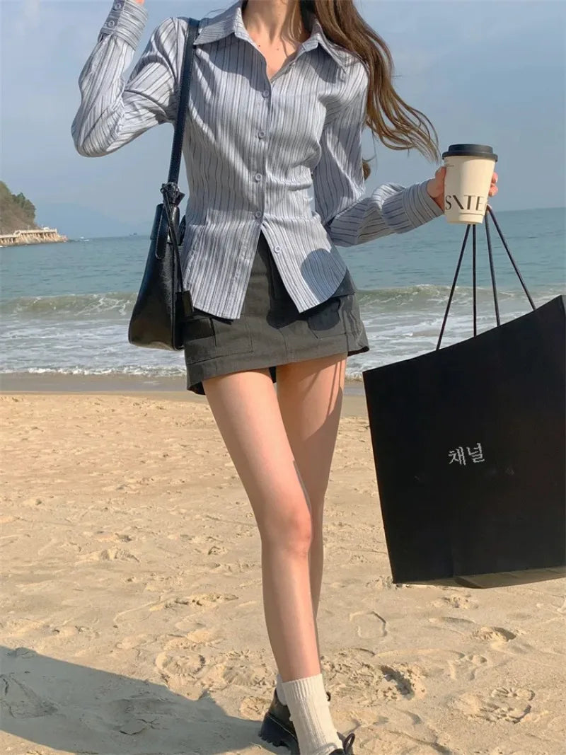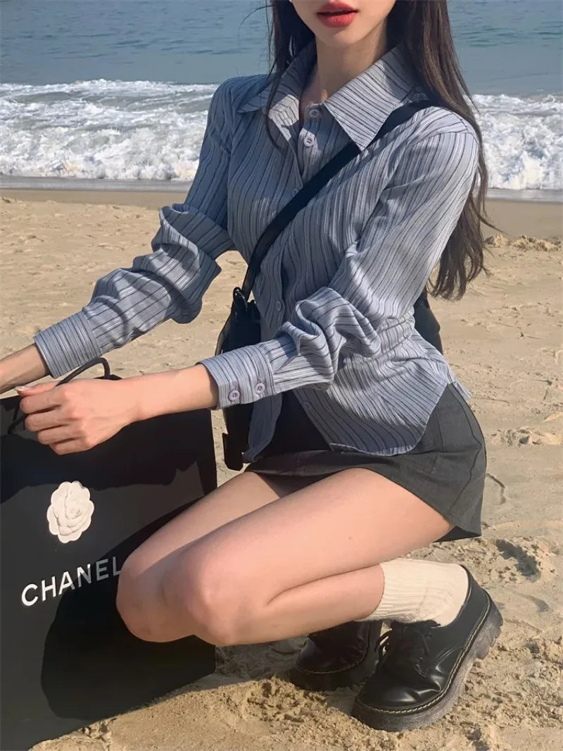 Dermearne Women Korean Polo Collar Striped Shirts Women New Shirt Waist Hugging Slimming Design Sense Versatile Top Long Sleeve Blouse