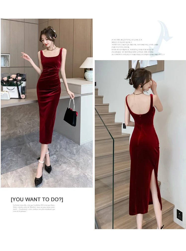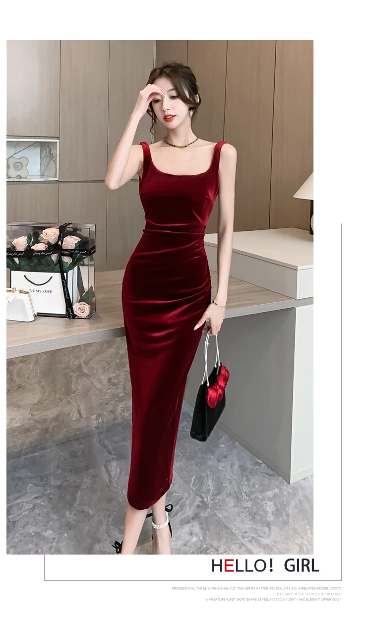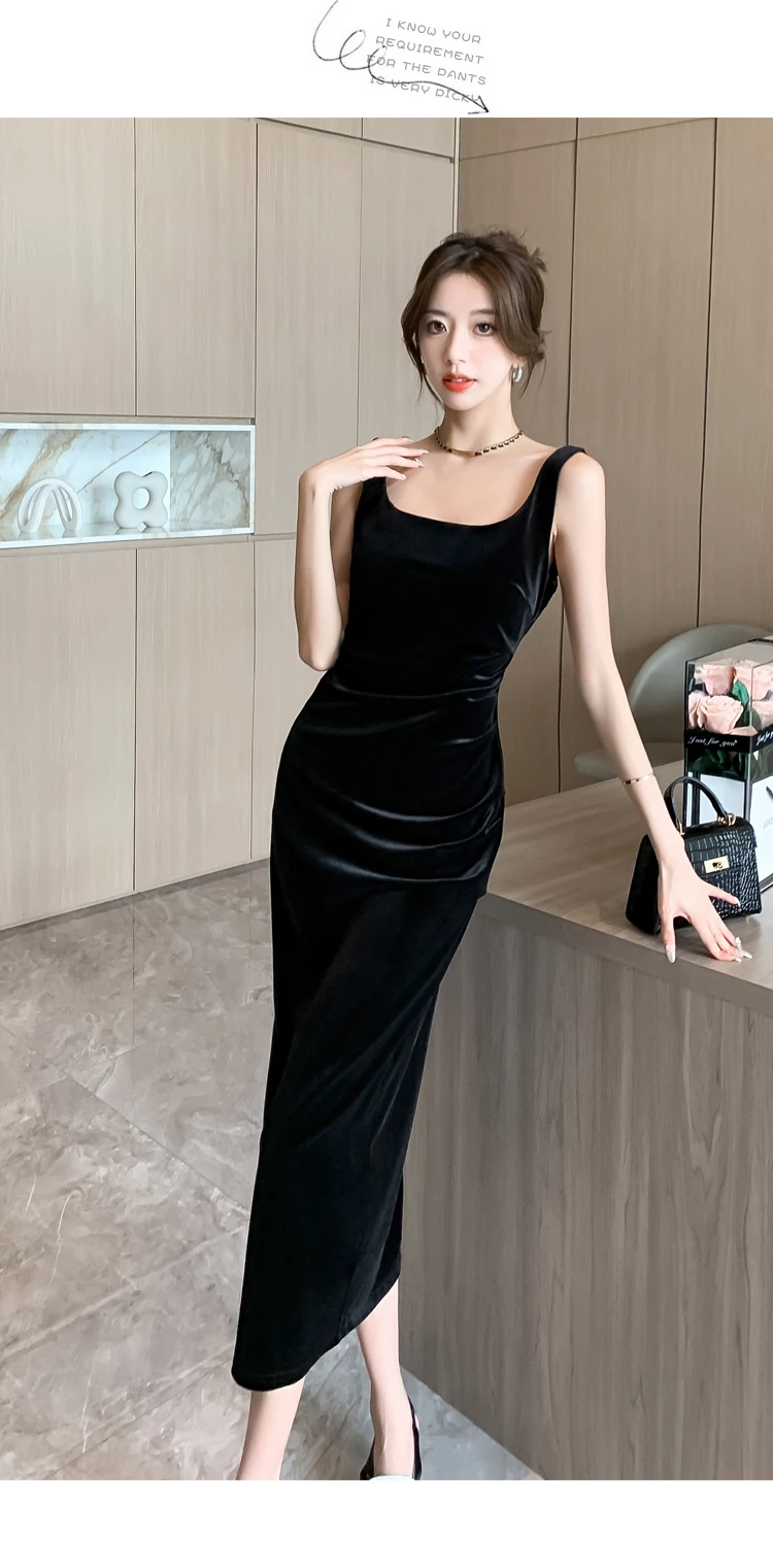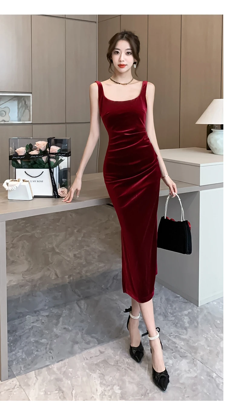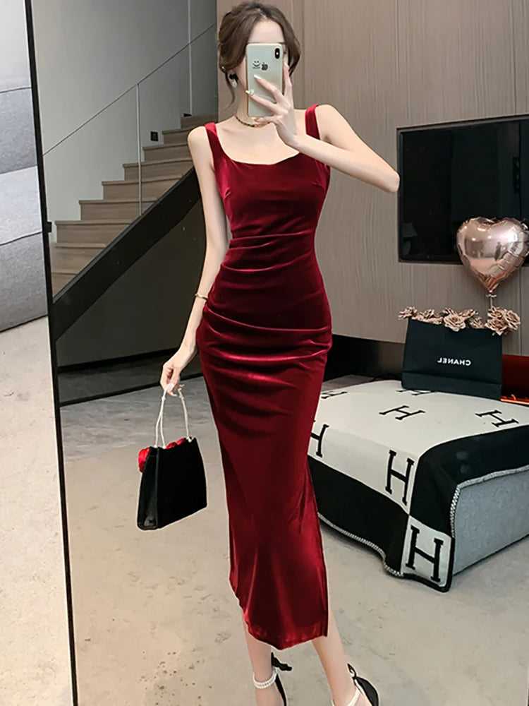 DERMEARNE Women Korean Vintage Luxury Evening Dress Gown Autumn Winter Black Velvet Sling Sexy Dresses 2025 Elegant Bodycon Party Vestidos