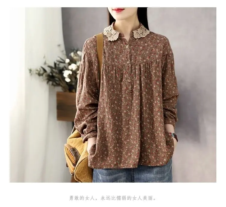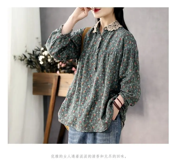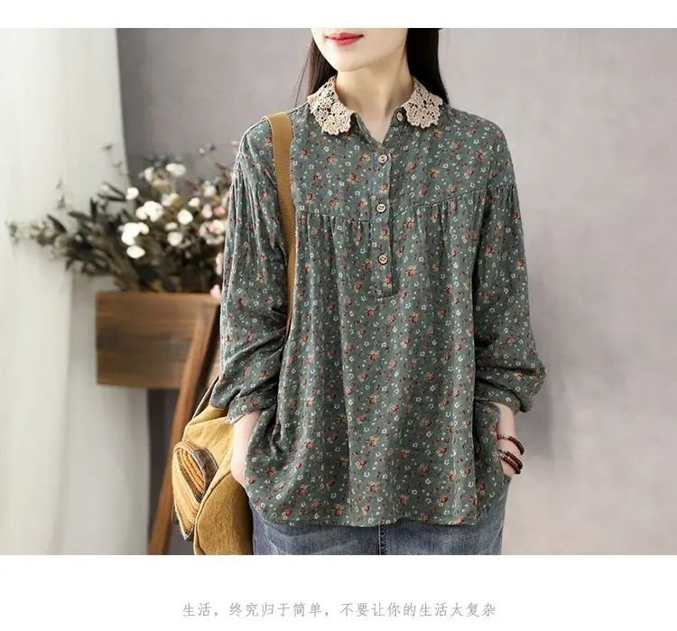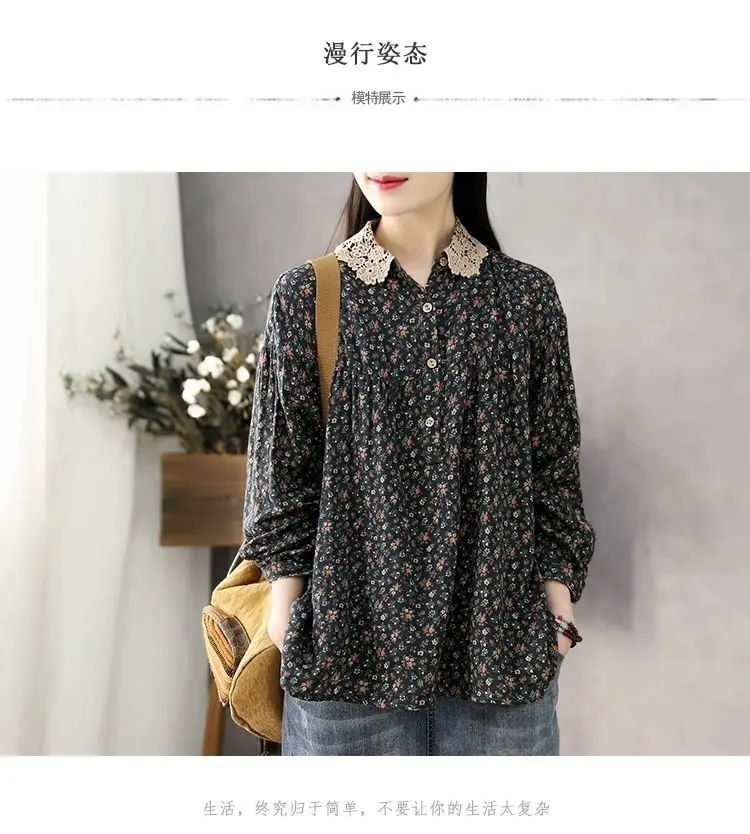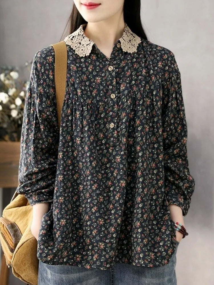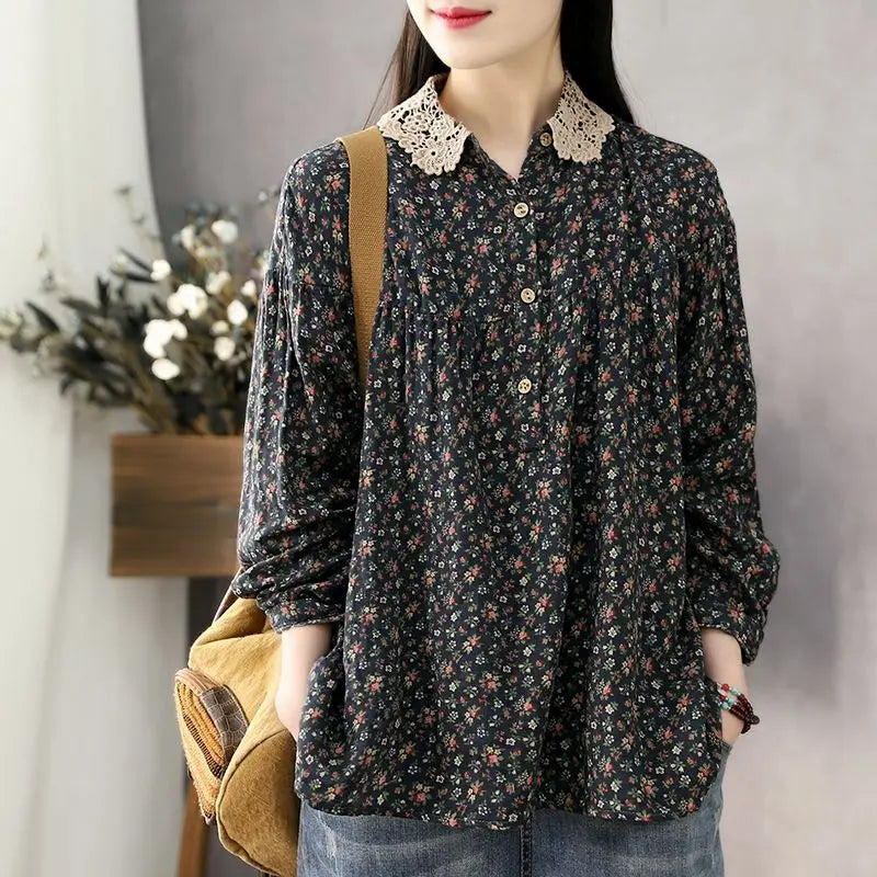 DERMEARNE Women Long Sleeve Casual Shirts New 2025 Spring Vintage Style Lace Collar Floral Print Loose Female Cotton Tops Shirt D147