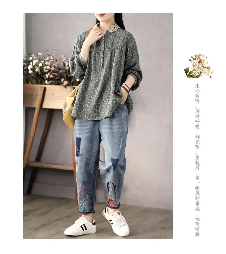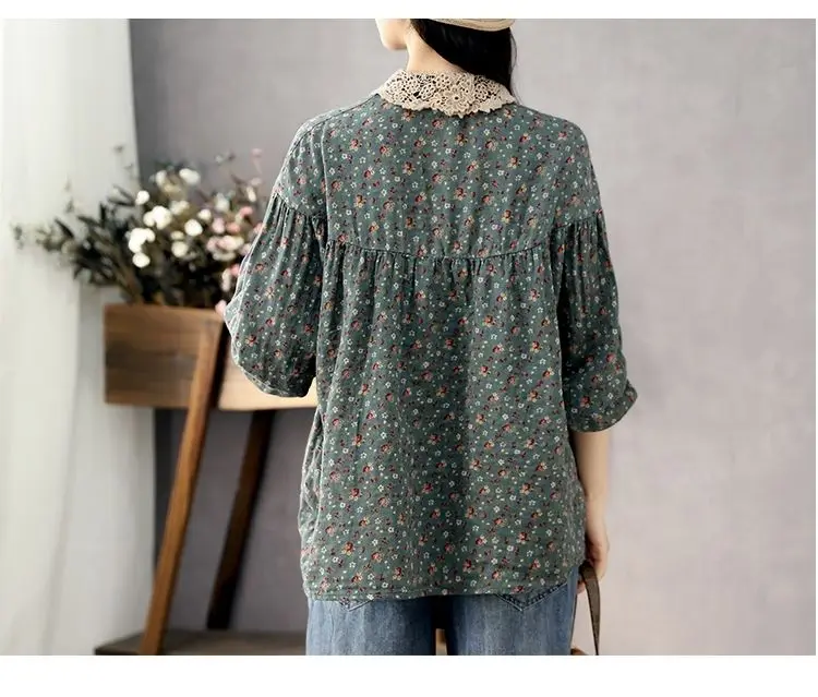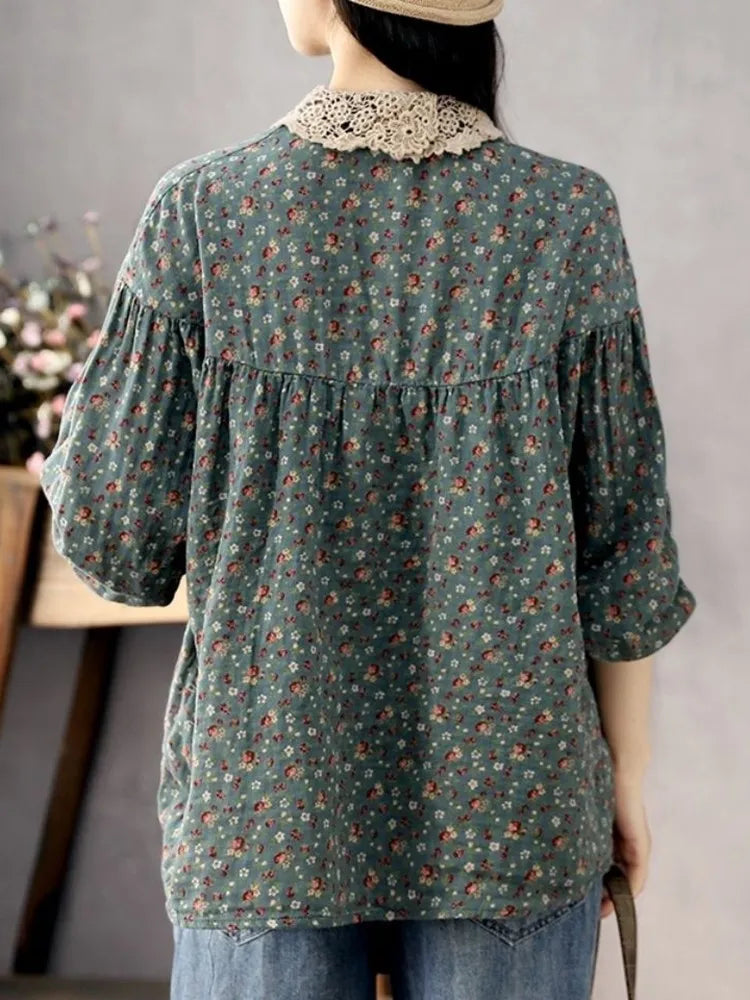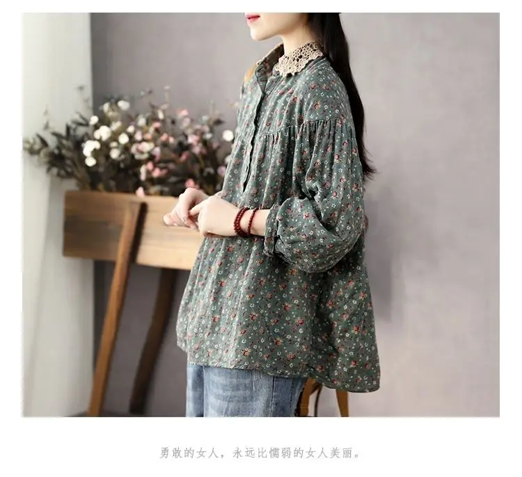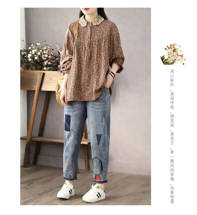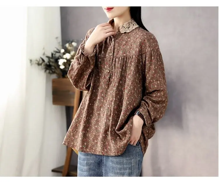 DERMEARNE Women Long Sleeve Casual Shirts New 2025 Spring Vintage Style Lace Collar Floral Print Loose Female Cotton Tops Shirt D147