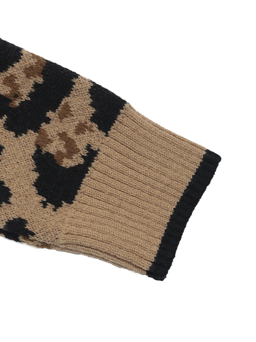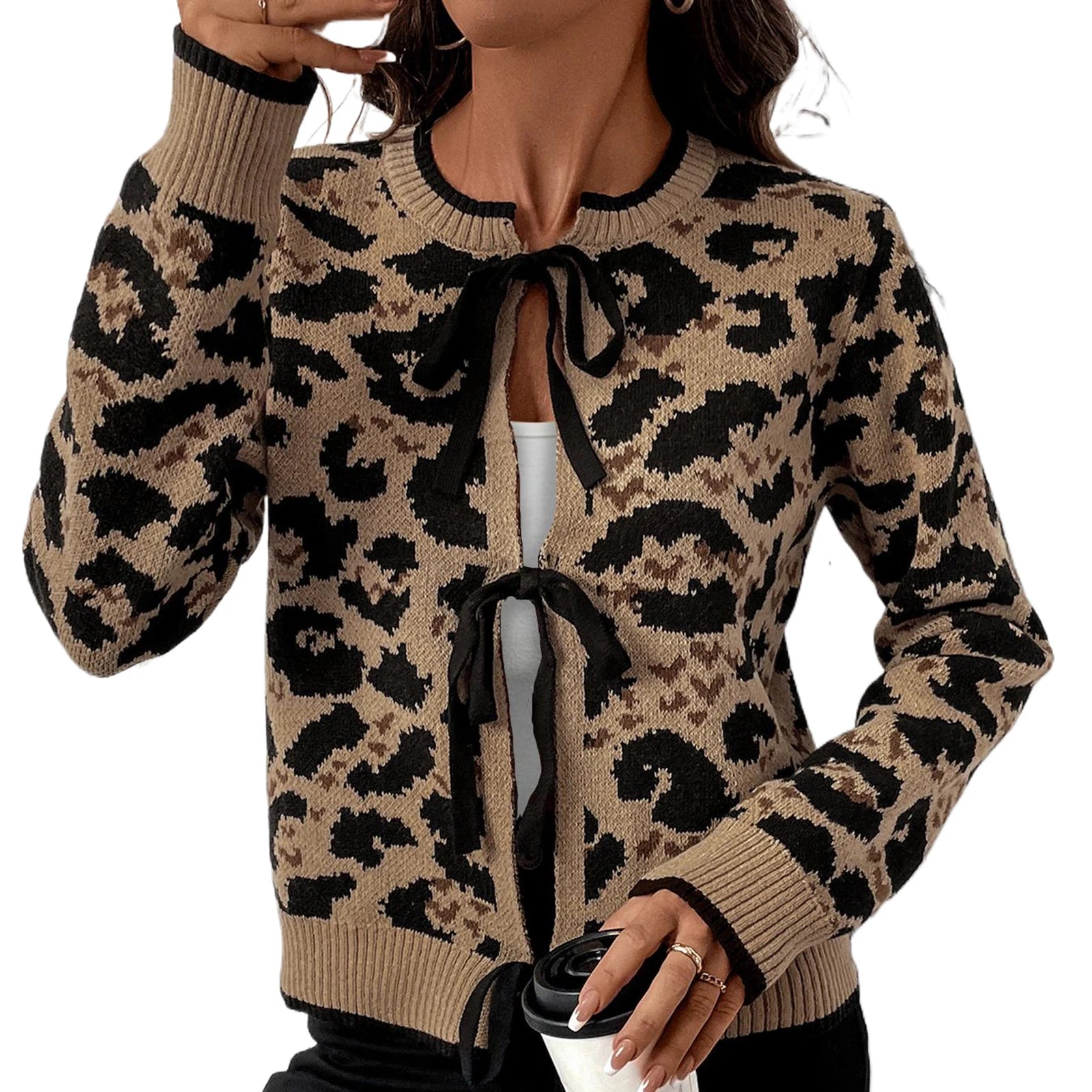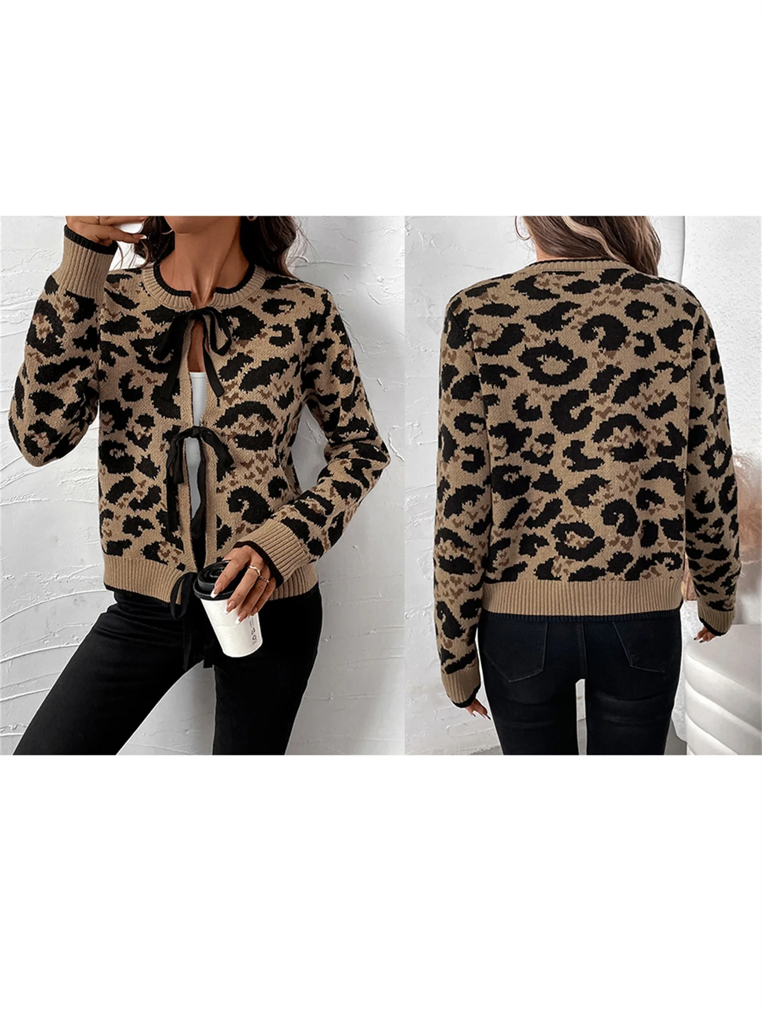 Women's Tie Front Knit Cardigan Bat Print Long Sleeve Crew Neck Loose Sweater for Fall Winter