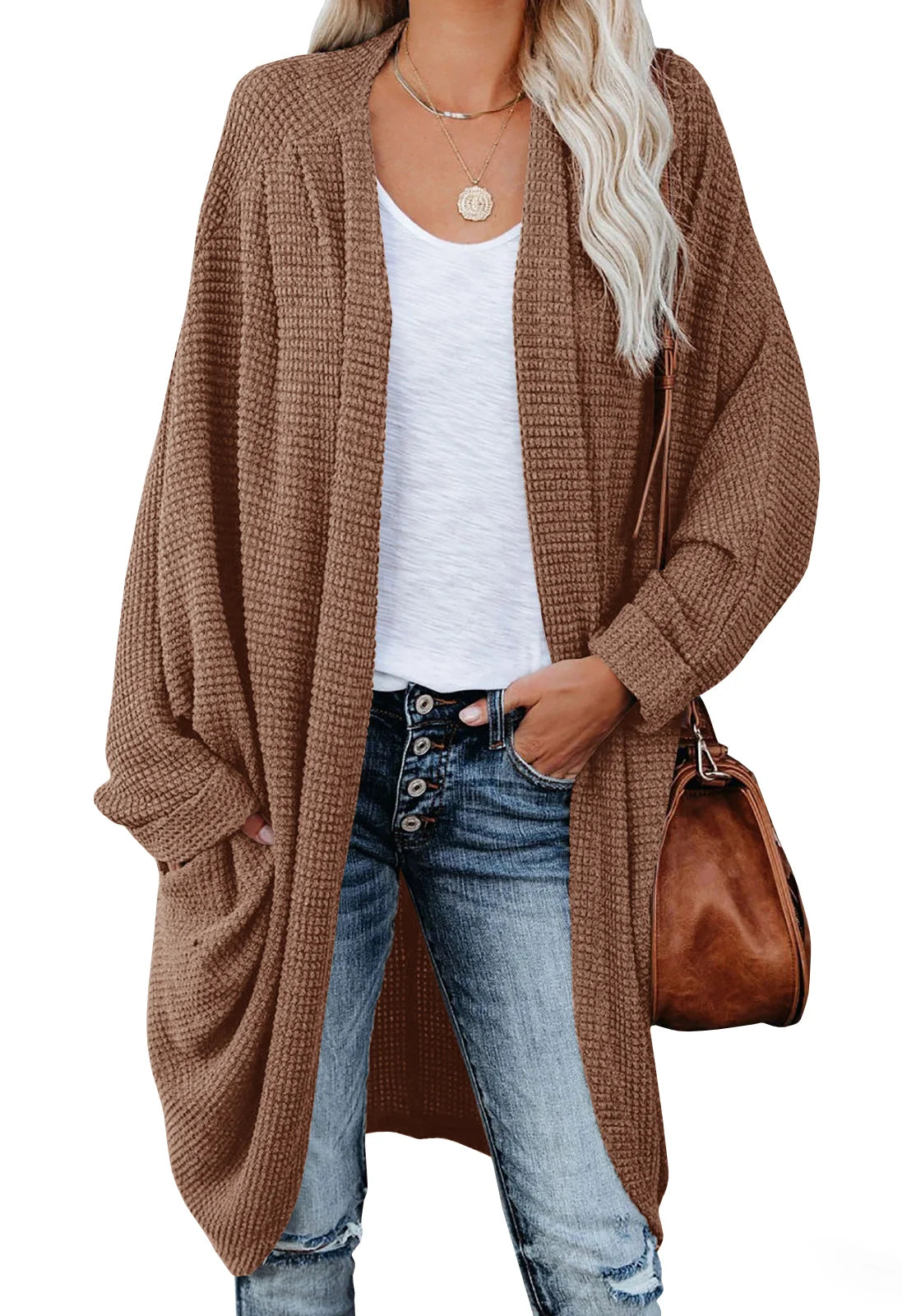 Womens Knit Cardigan Open Front Chunky Waffle Cable Boho Pockets Coat Casual Lantern Sleeve Oversized Sweater For Women Autumn