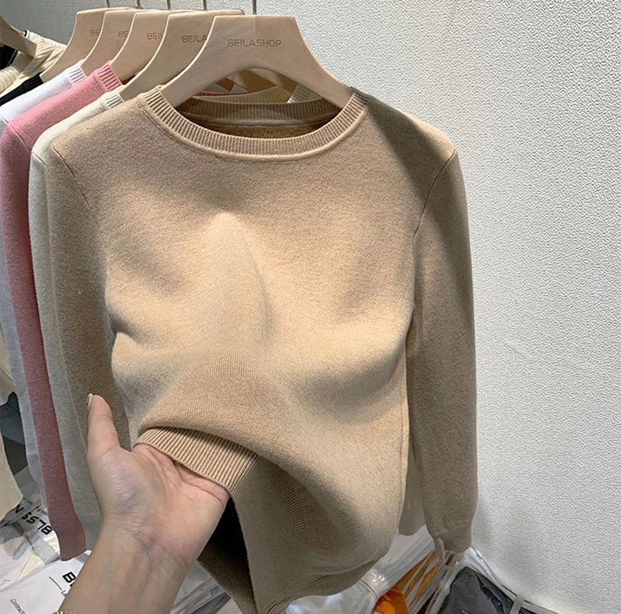 DERMEARNE Women's O-neck Plus Velvet Thicken Sweaters Winter Slim Warm Long Sleeve Knitted Tops Casual Basic Fleece Lined Soft Pullover