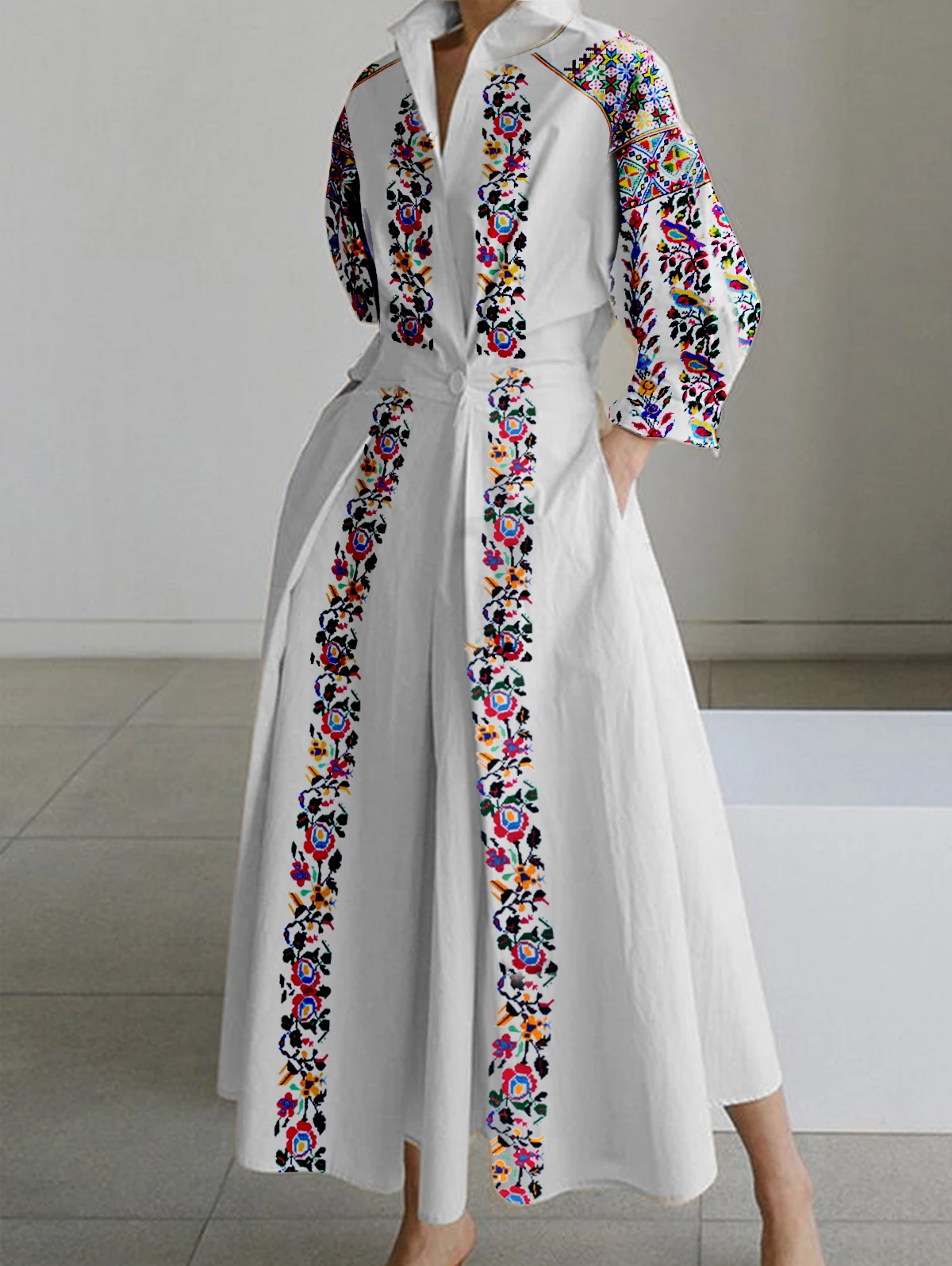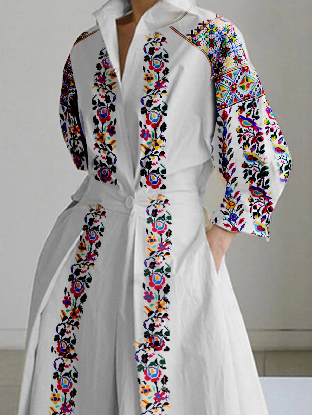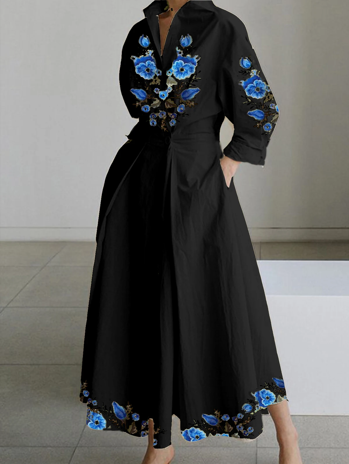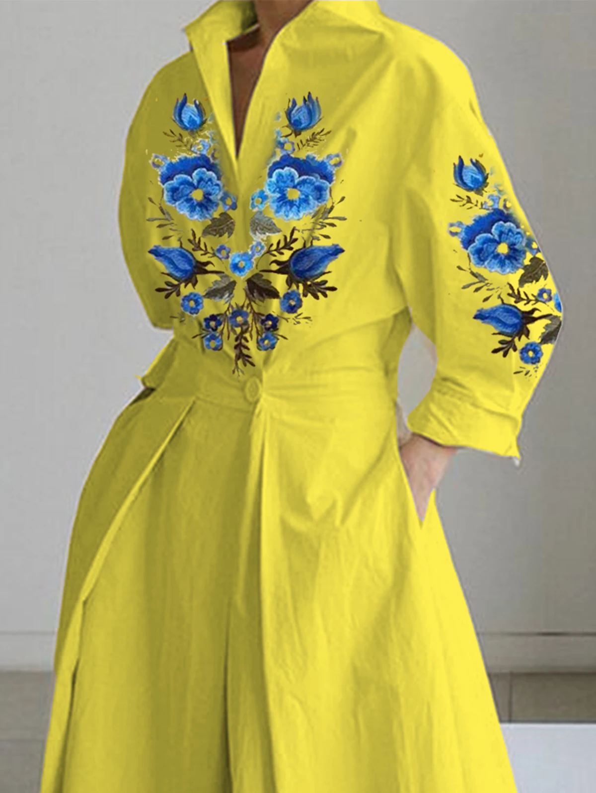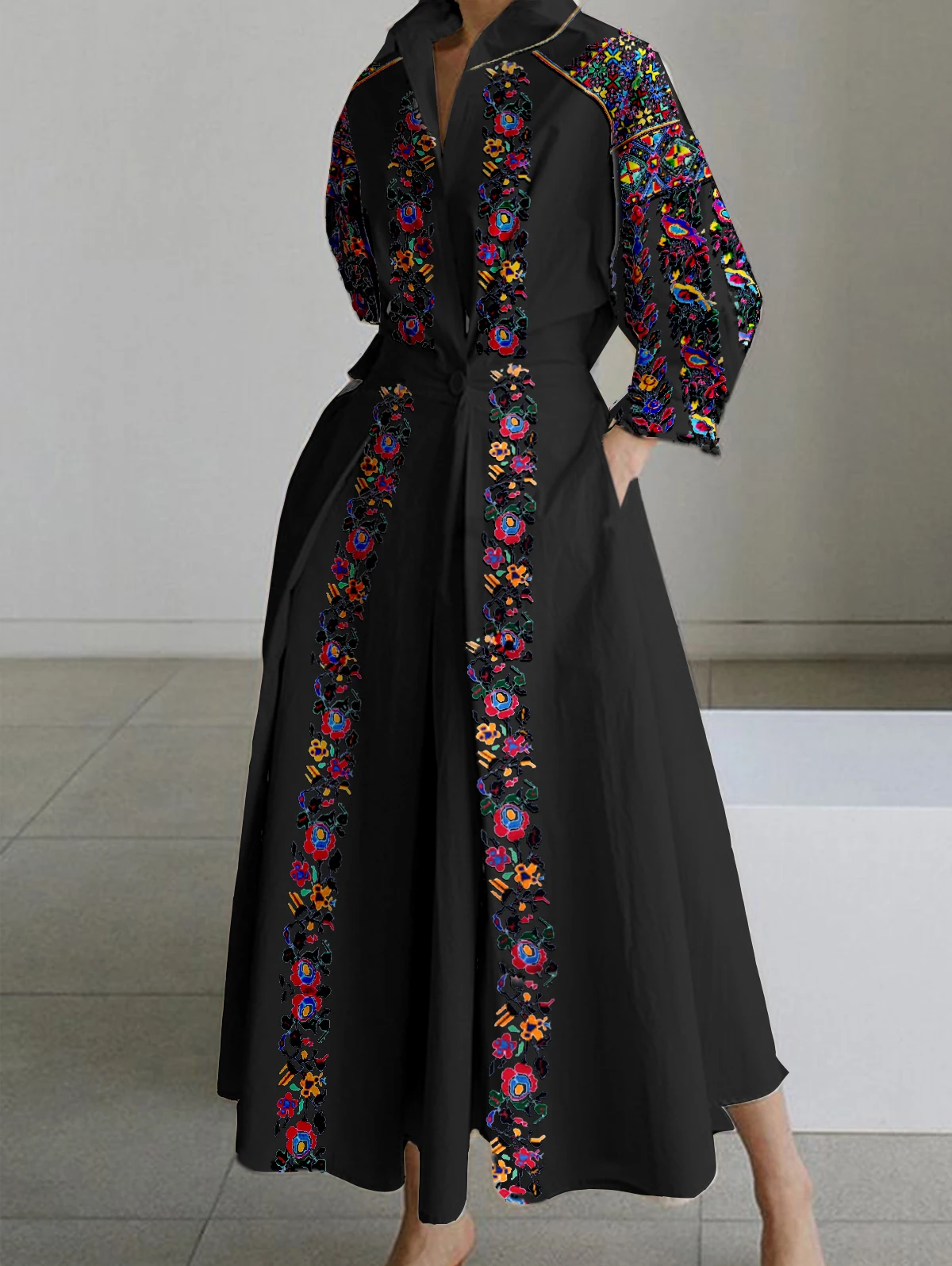 DERMEARNE Women's Shirt Dress Long Sleeve Floral Printed Turn Down Collar Vintage Casual Autumn A-line Pleated Midi Dress for Female Dress