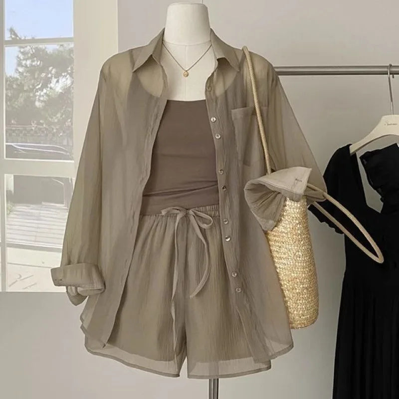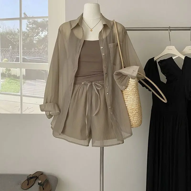 DERMEARNE Women's three-piece summer new thin sunscreen shirt top+slim suspender vest+loose Joker shorts.
