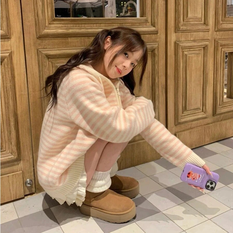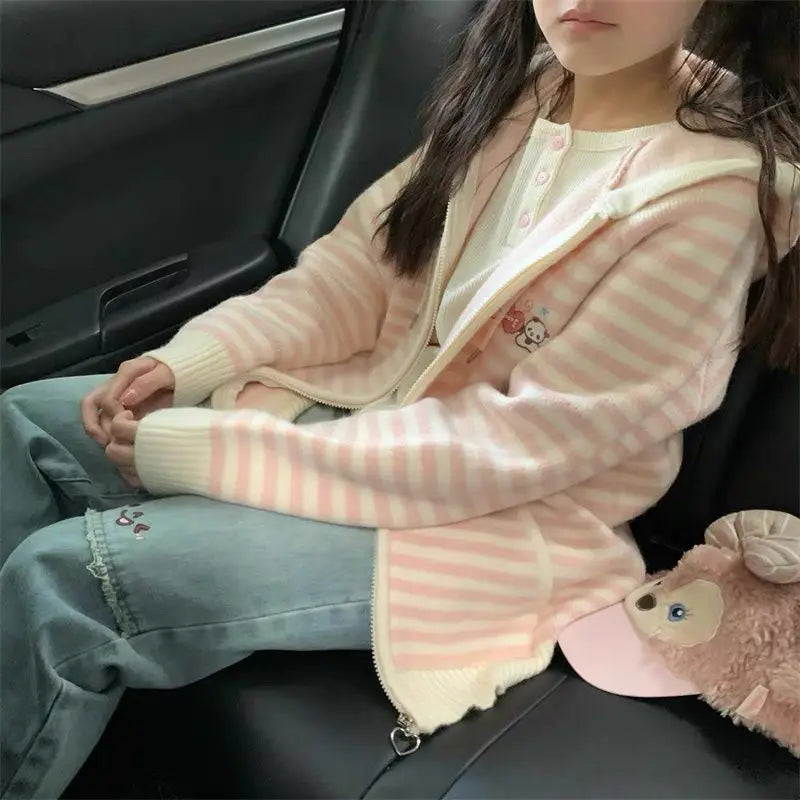 DERMEARNE Y2k Aesthetic Cartoon Embroidery Hooded Cardigans Casual Grunge Contrast Color Stripe Tops Worean Japanese Loose Zipper Sweater