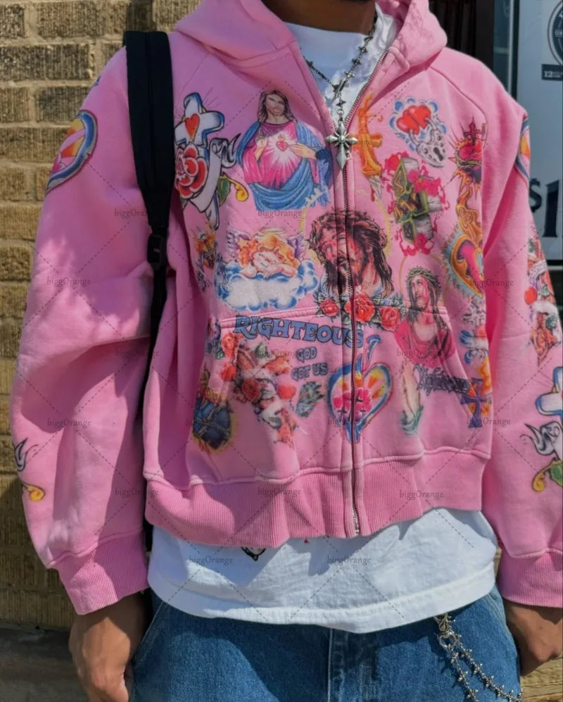 DERMEARNE Y2K Harajuku Retro Oversized Zipper Hoodie Street American Style Cross Print Hoodie Trendy Casual All-match Sweatshirt Jacket