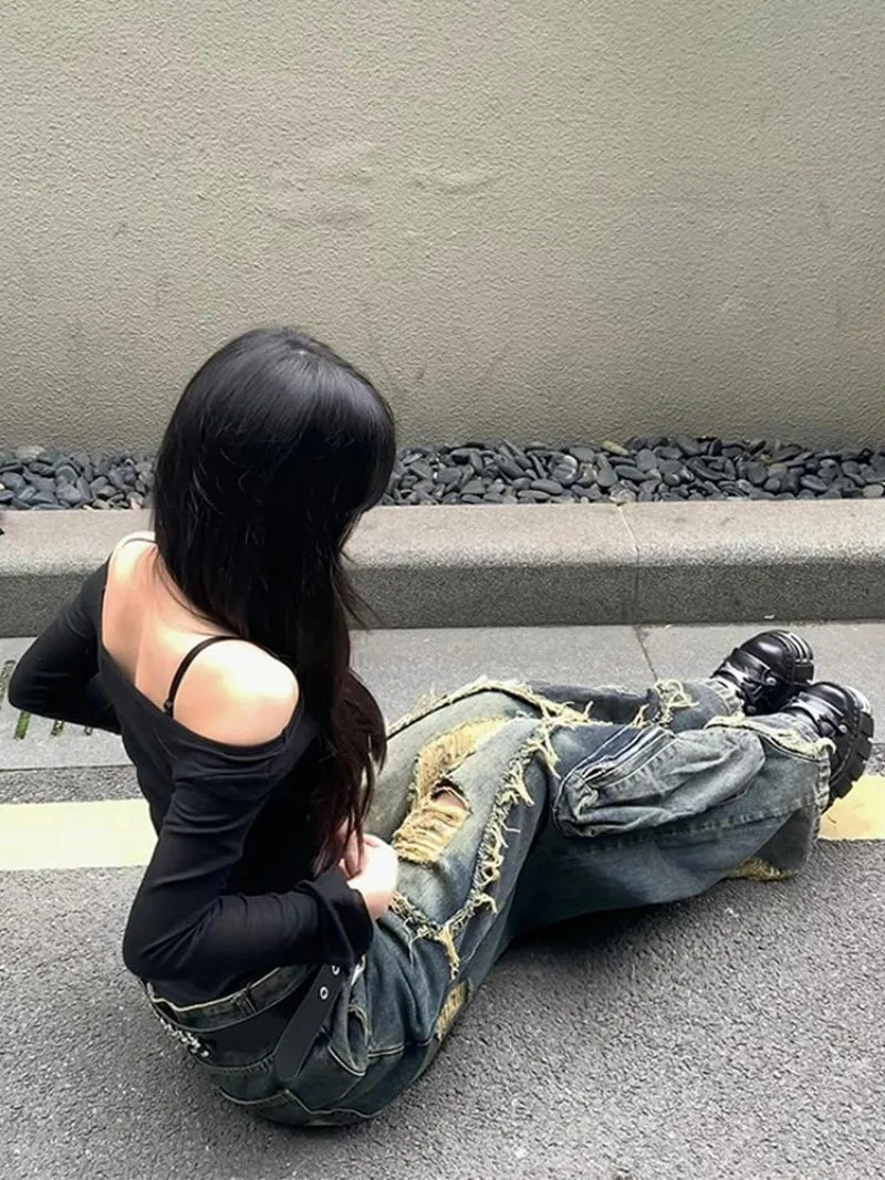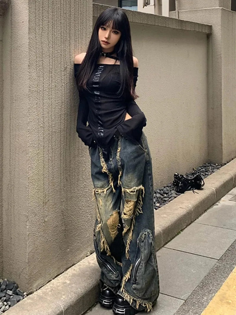 DERMEARNE Y2K High Street Ripped Tassel Washed Baggy Jeans Woman Retro Street Hip-hop Loose Old Fashion Casual High Waist Wide Leg Jeans