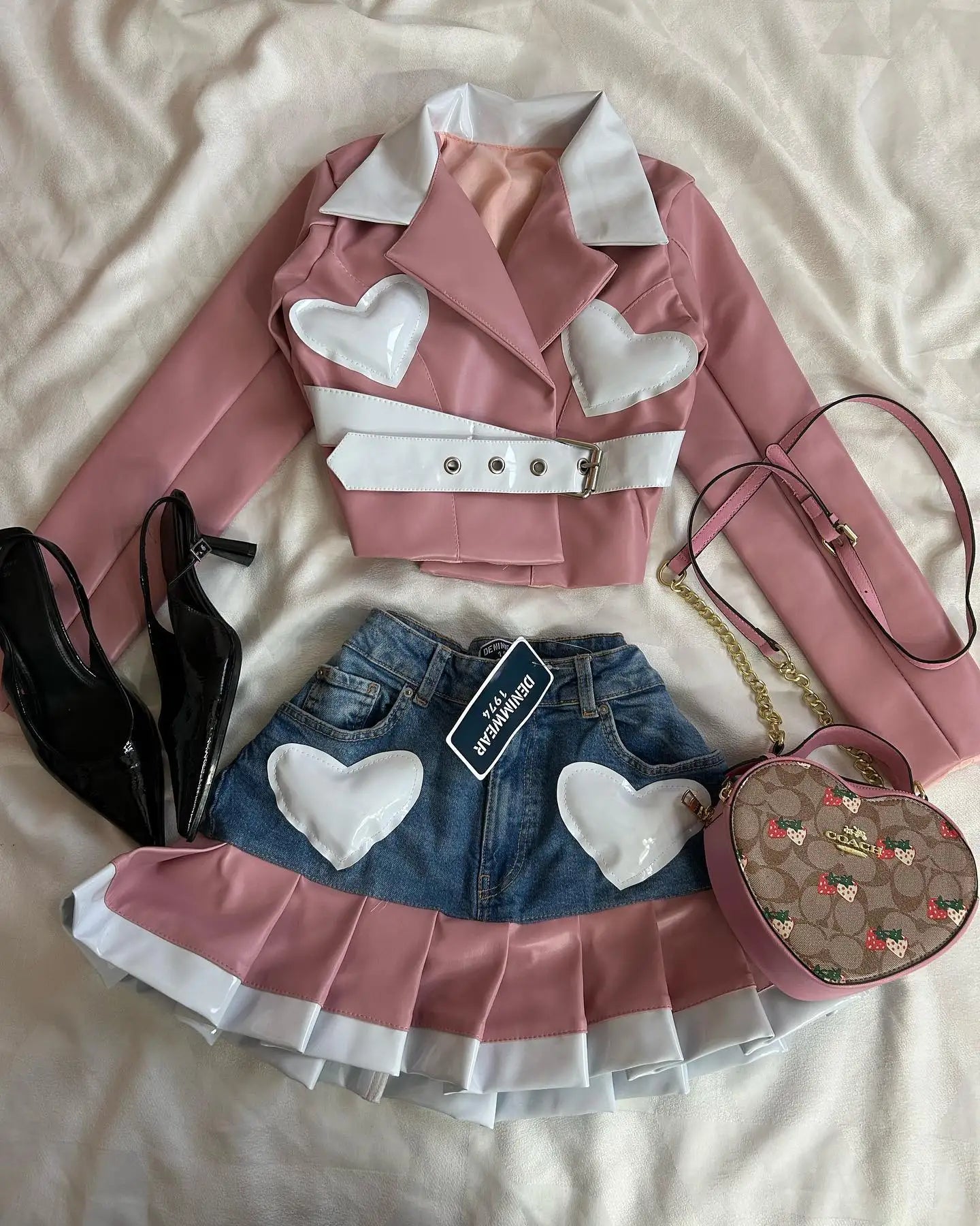 Y2K Womens Streetwear Heart Shaped Leather Clothing Two Piece Set Gothic Punk Pink Jacket Cut Denim Patchwork Pleated Mini Skirt
