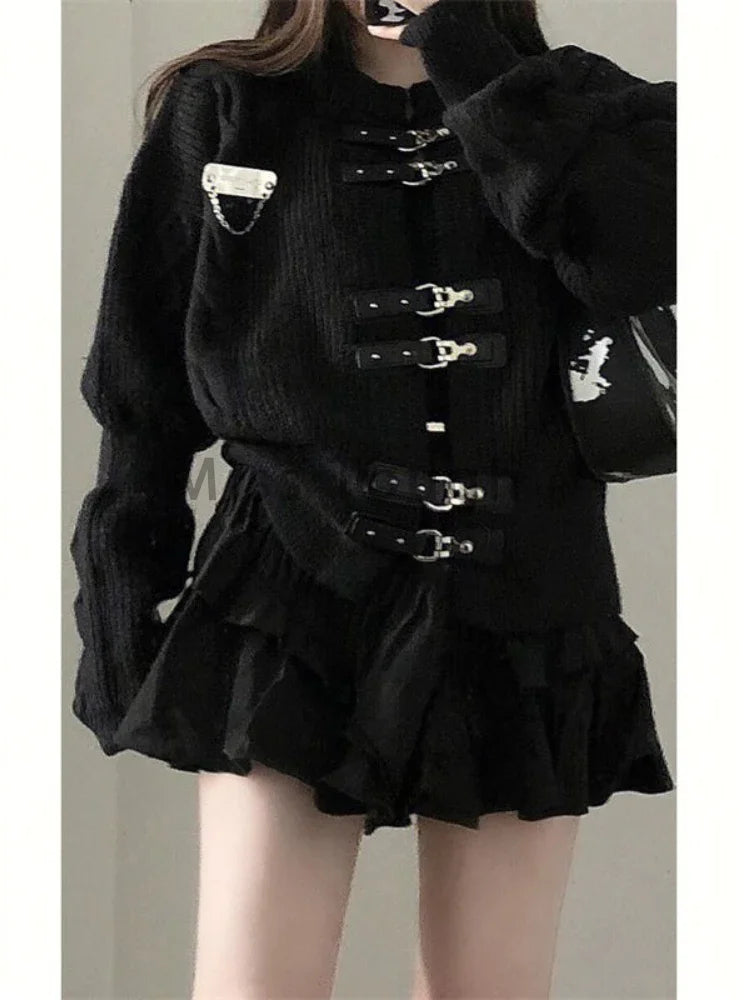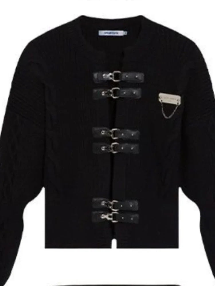 Design Sense Leather Buckle 2 Piece Set Women Autumn Cardigan Sweater Coat +A-Line Pommel Skirt Female Y2k Sexy Fashion Suit