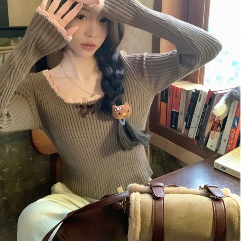 Elegant Sweet Sweaters Women Lace Bow Kawaii Knitted Pullovers Korean Style Long Sleeve Cute Fashion Aesthetics Jumpers