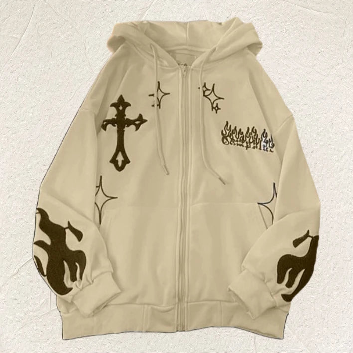 Dermearne European and American Autumn/Winter Hoodie Embroidered Cross Flame Coat Plush Couple Loose Top Sweater