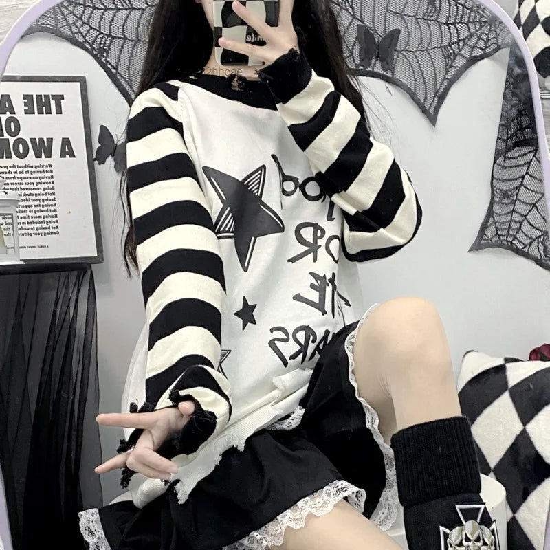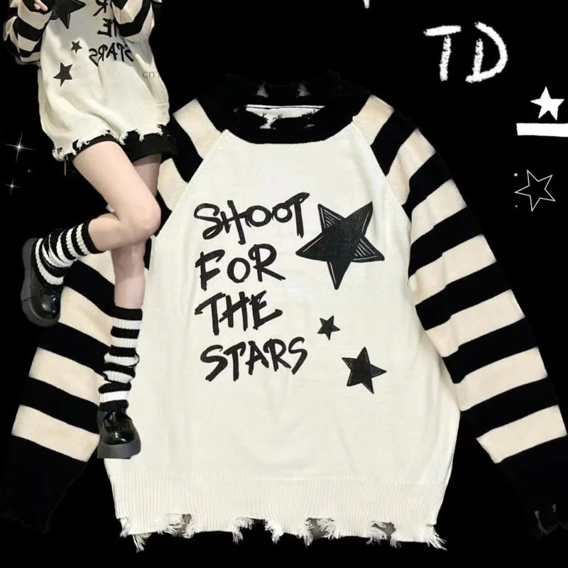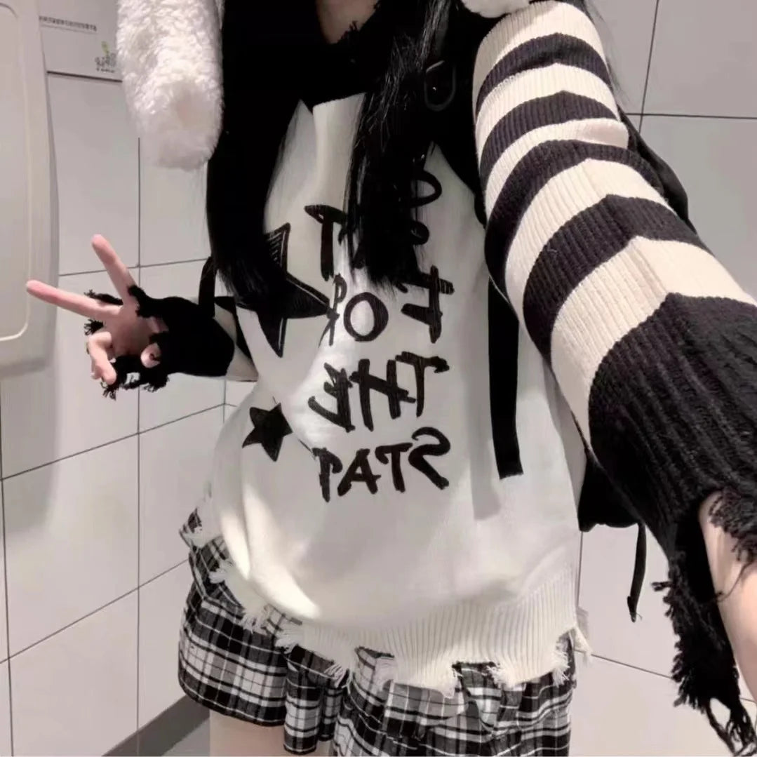 Fashion New Star Letter Stripe Graphic Y2K Sweater Autumn Long Sleeve Women's Vintage Punk Harajuku Knitwear Girls Gothic Tops