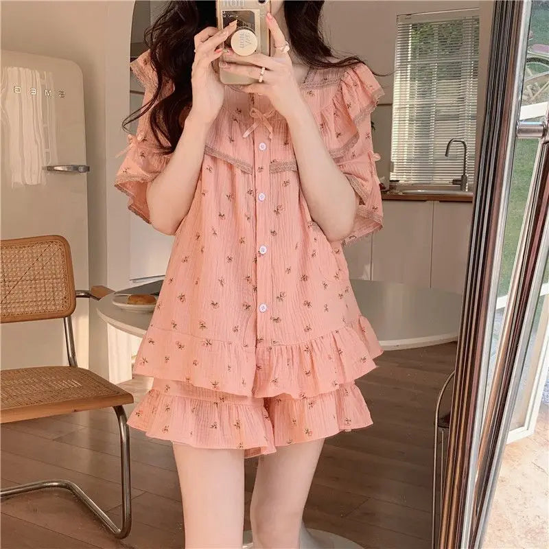 Dermearne Floral Sleepwear Women Pajama Sets Korean Piiama Sets 2 Pieces Ruffle Night Wears Short Sleeve Pyjamas Bow Summer Lace Home Suit