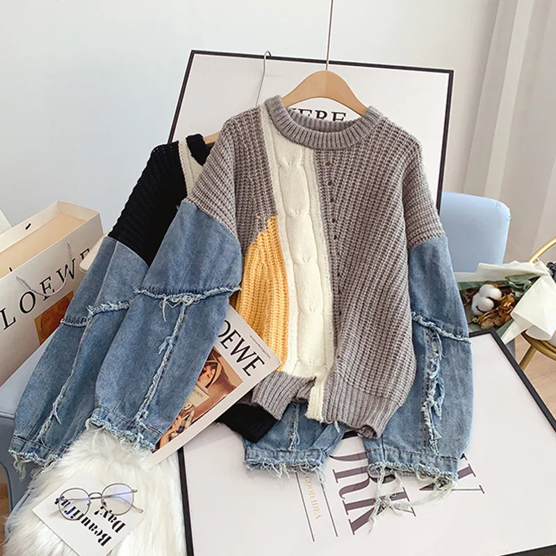 Frayed Patchwork Long Sleeve O-Neck Mohair Knit Jumpers Women's Sweater Loose Female Sweaters Tops Woman Clothing Fashion
