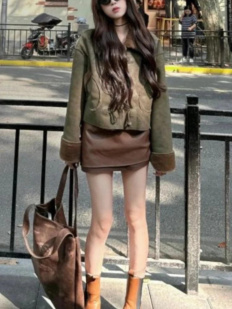French Vintage Jacket Women Pockets Sets Elegant Female Korean Fashion Loose Overcoat Suit Casual Long Sleeve Coat+leather Skirt