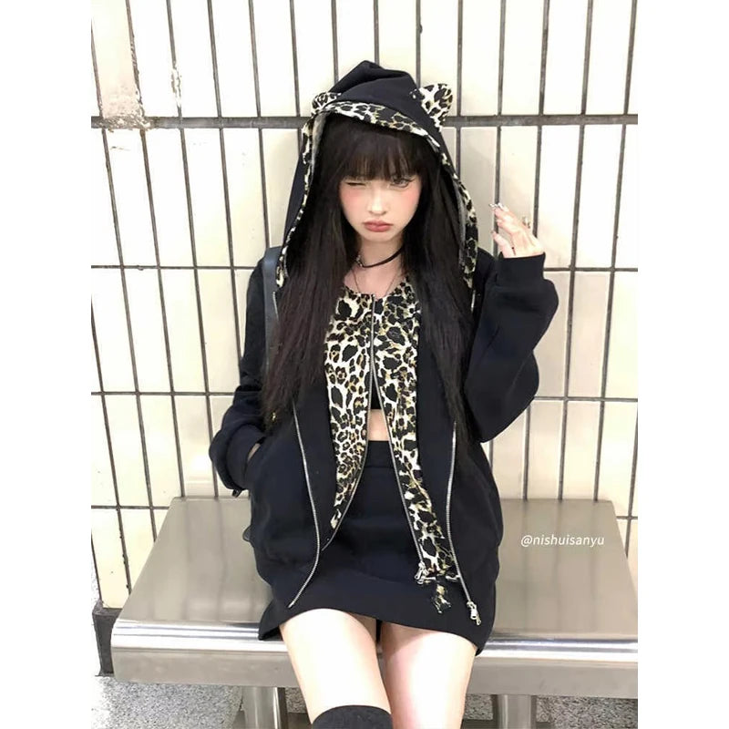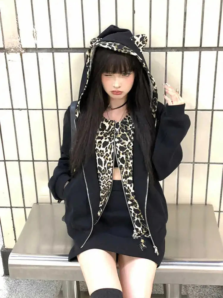 Harajuku Leopard Print Women Zip Up Hoodies Vintage Gyaru Streetwear Japanese Style 2000s Aesthetic Sweatshirt Oversize