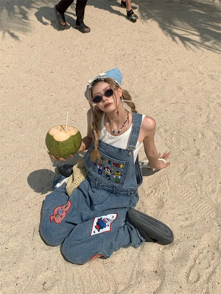 Kawaii Fun Cartoon Embroidered Denim Camisole Pants for Women New Loose Versatile and Casual Oversized American Retro Jumpsuits