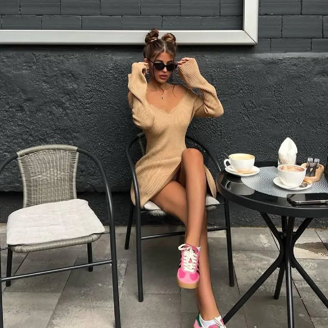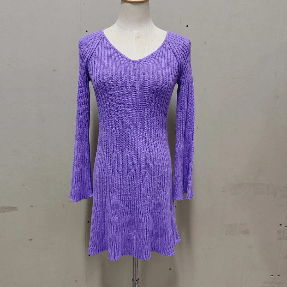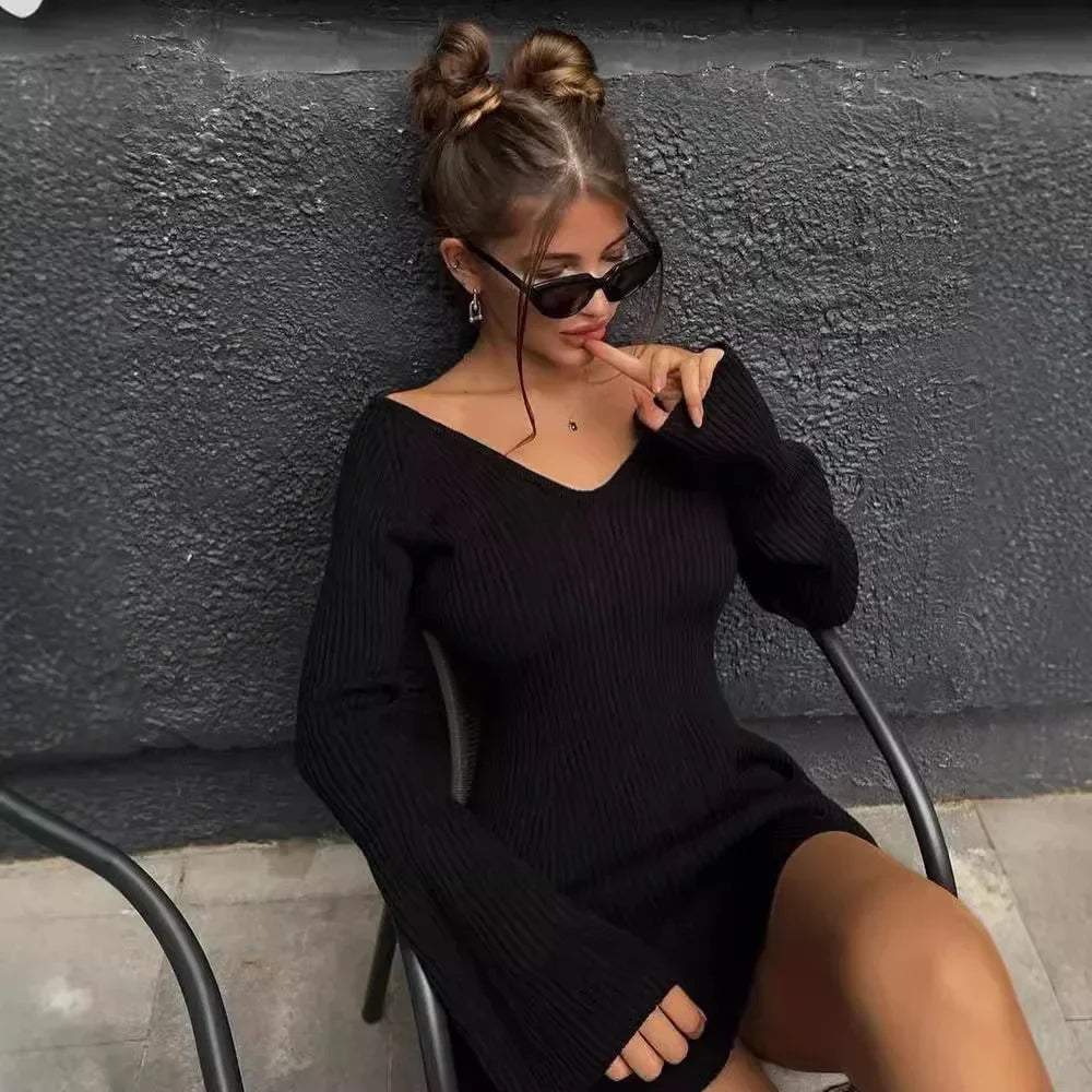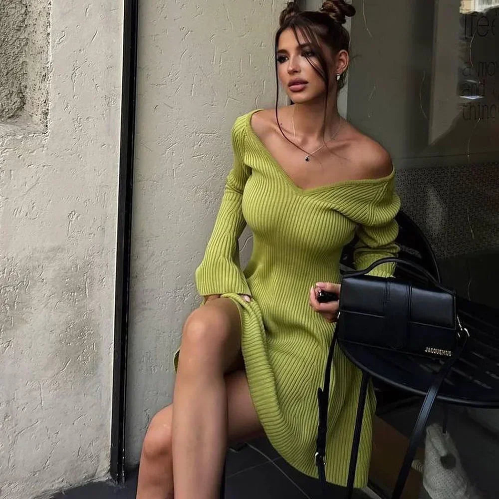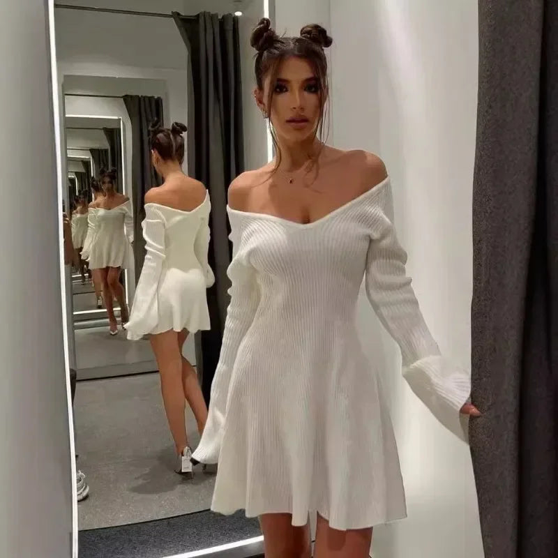 Knitted Off Shoulder V Neck Mini Dress Women's Sexy High Waist Long Sleeve Dress White Knitted Sweater Dress Robe Women