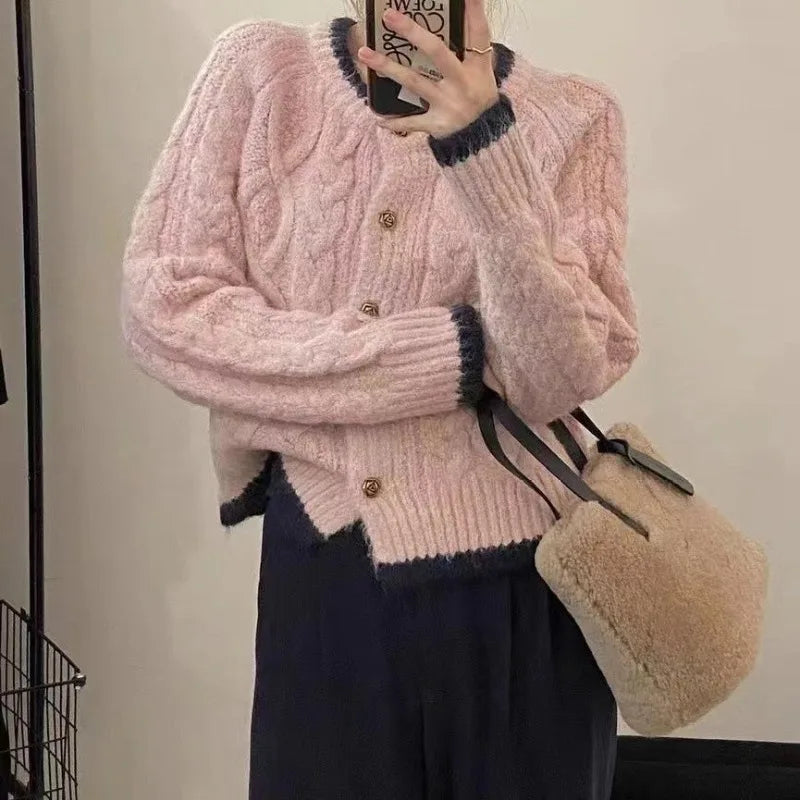 Korean Style Pink Sweater Women Autumn Long Sleeve Knit Cardigan Old Money Vintage Loose Knitwear Female Aesthetic