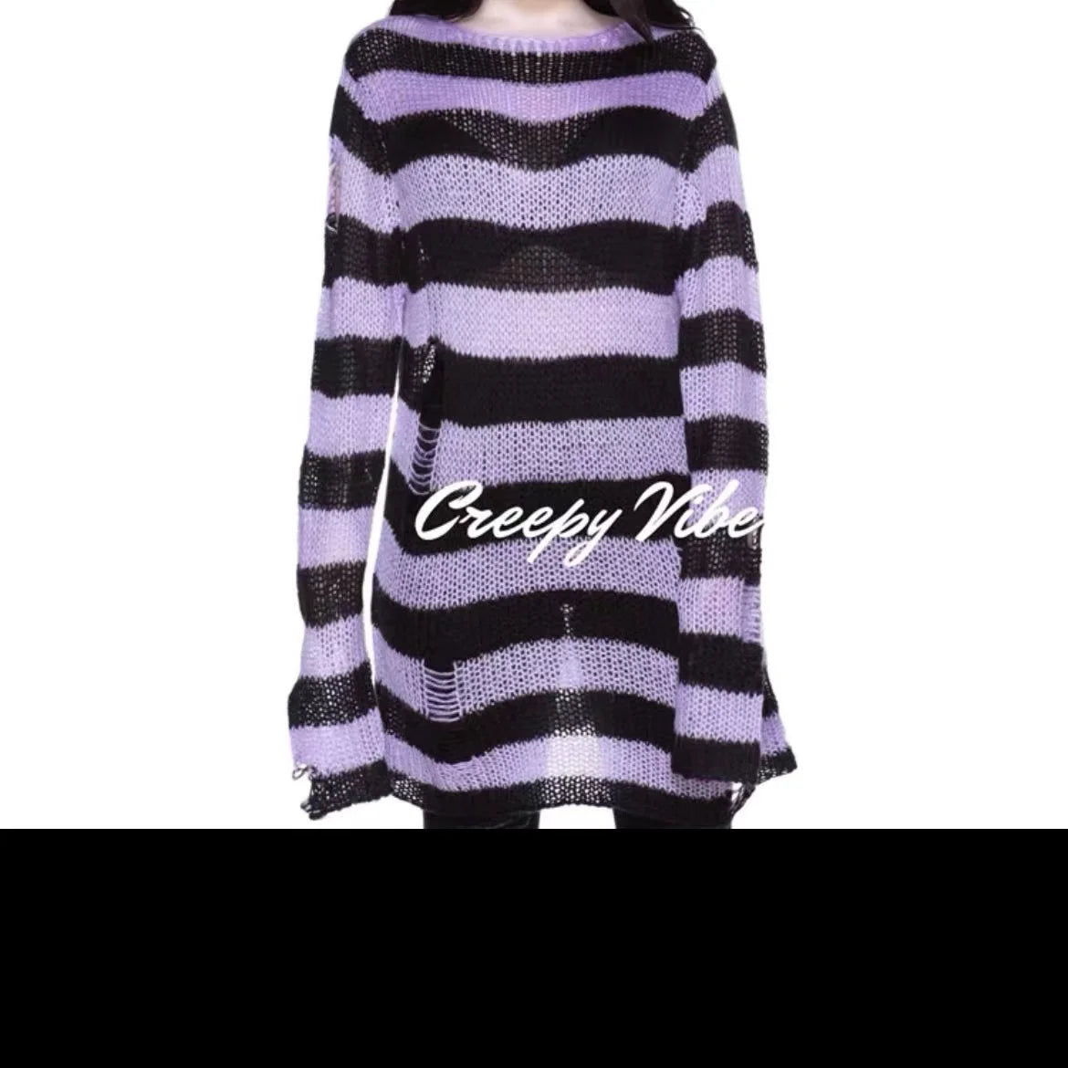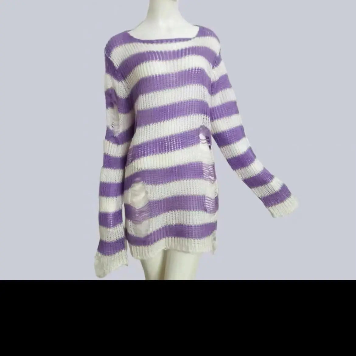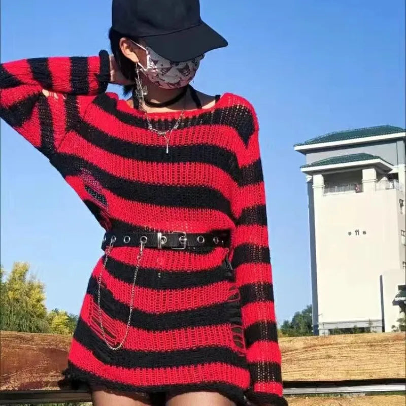 Dermearne New Punk Gothic Sweater Oversized Pullovers Women Striped Cool Hollow Out Hole Broken Jumper Harajuku Aesthetics Sweater