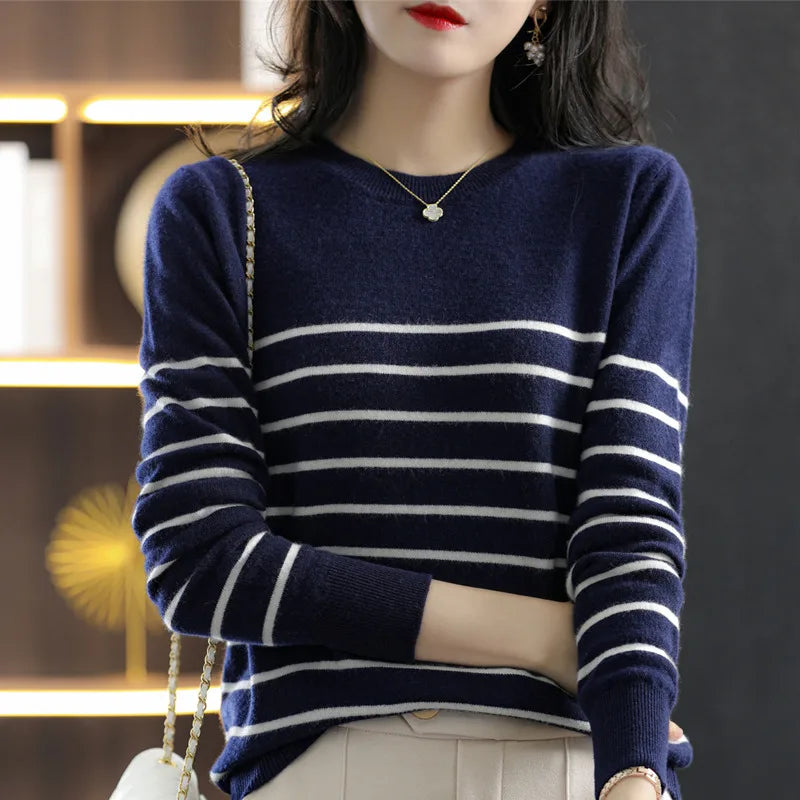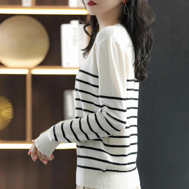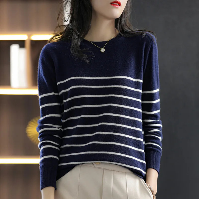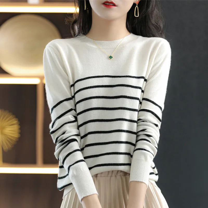 Pure Cotton Line Stripe Pop Sweater Women's Spring And Autumn Blouse Round Neck Knit Loose Inside With Outside Wear Bottom SMY18