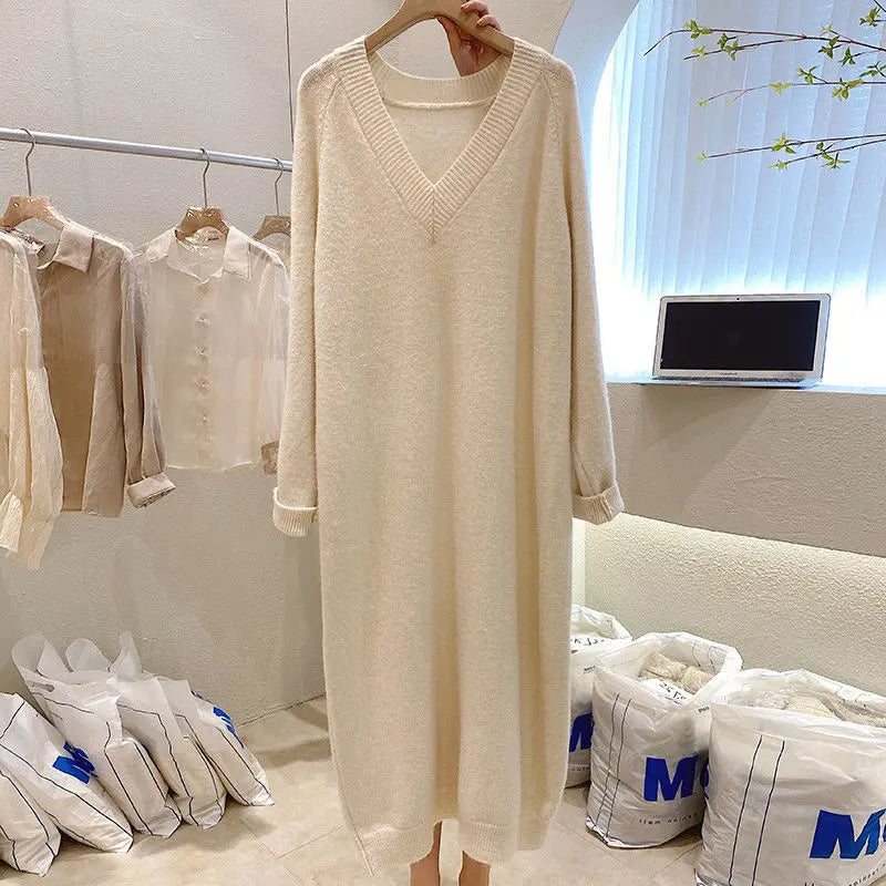Size High Quality Sweater Dress for Women Solid Color V Neck Pullover Thick Autumn and Winter Long Dress