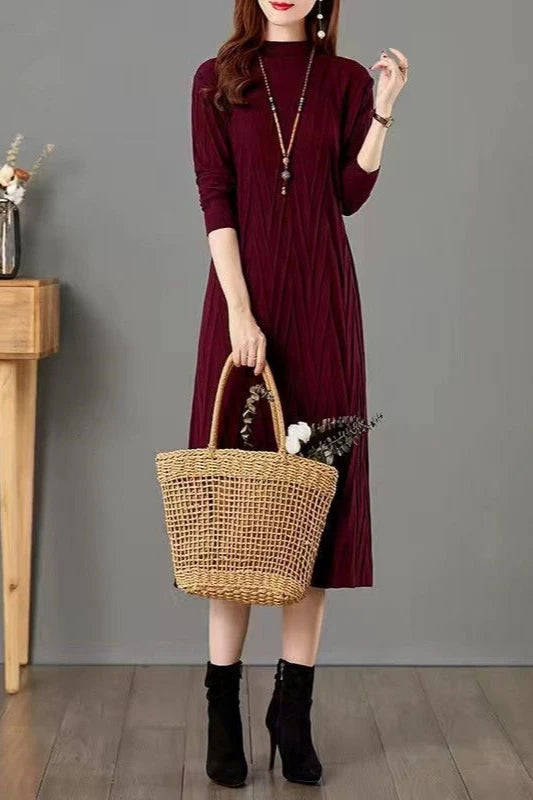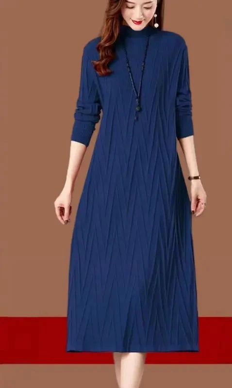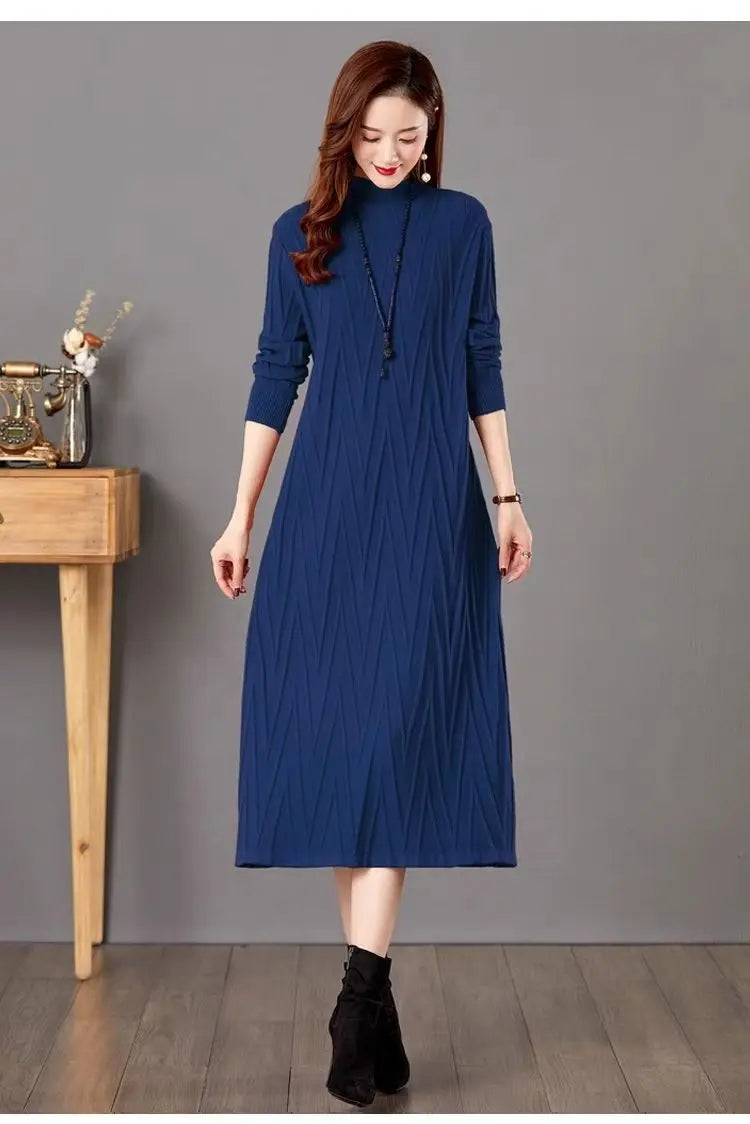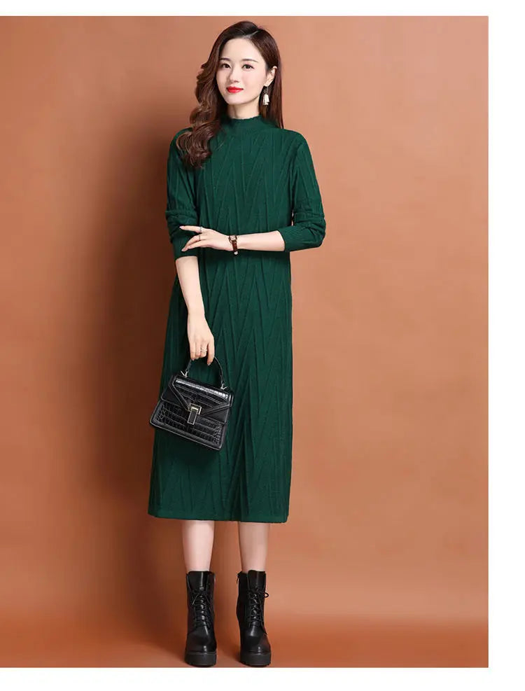 Solid Color Woolen Sweater 2024 Autumn Winter Dress Women's Large Size Medium Length Over The Knee Knitted Dress Casual LJ563