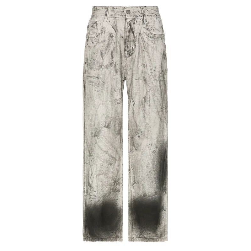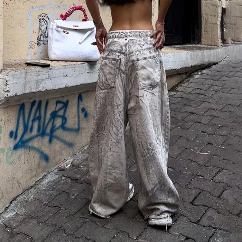 Streetwear Scrawl Low Waist Jeans Women Washed Graffiti Painted Baggy Cargo Pants Y2k Slouchy Casual Wide Leg Trousers