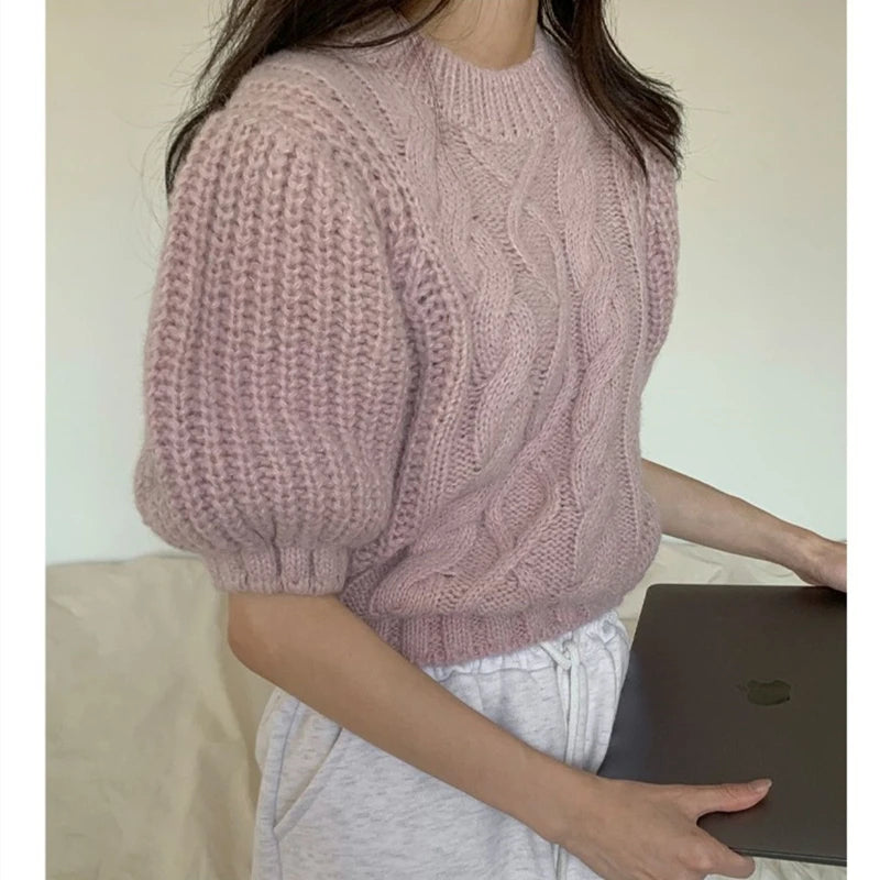 Summer autumn Women's Knitted Pullover Fashion puff Sleeve solid Sweater crop Top Elegant loose Lapel Knitted Pullover gray Tops