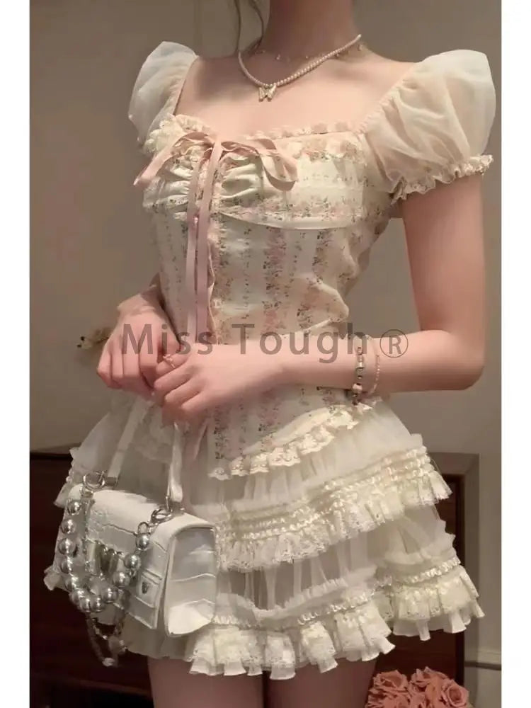Summer Sweet Lace Print 2 Piece Set Women Bow Strappy Tops + Cake Mini Skirts Female Fashion Chic Kawaii Streetwear Suits 2024