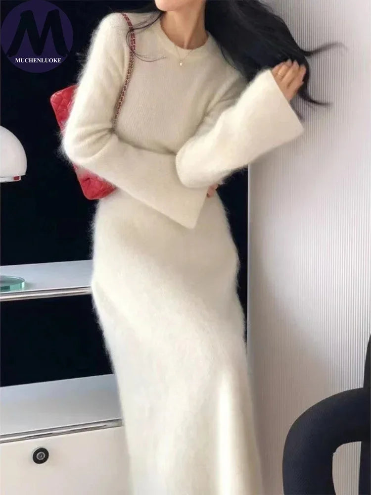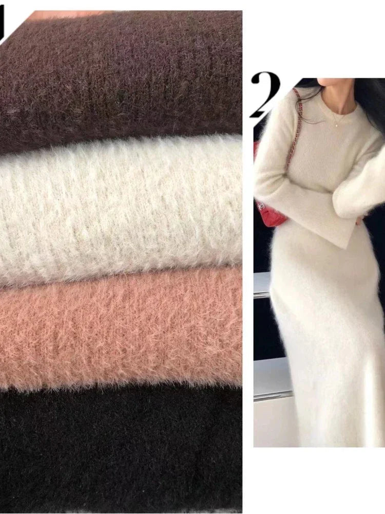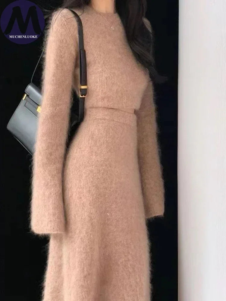 Two Piece Set for Women Imitation Mink Velvet O Neck Sweater Top Suits Slim Fit Dress Sets New Autumn Winter 2024