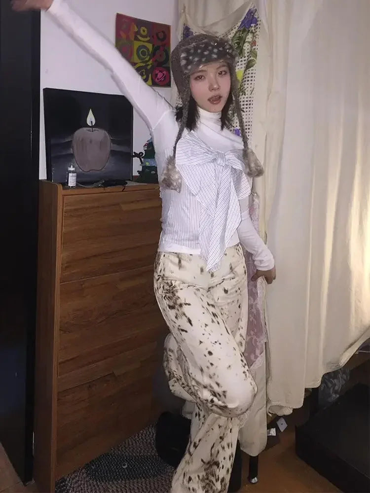 Vintage Leopard Jeans Women Japanese Y2k Harajuku Hippie Straight Jeans Baggy Denim Trousers Pantalon Animal Print Mujer
