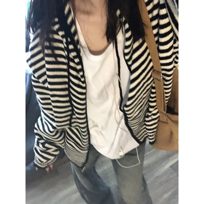 Vintage Striped Sweaters Cardigan Women Casual Korean Style Zip Up Knitwear Harajuku Loose Black White Knitted Coats