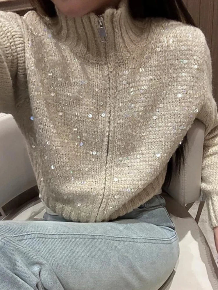 Winter Autumn Turtleneck Sequined Jacket Thick Knit Cardigan Coat for Women's New Style High-Quality Zipper Sweater Top