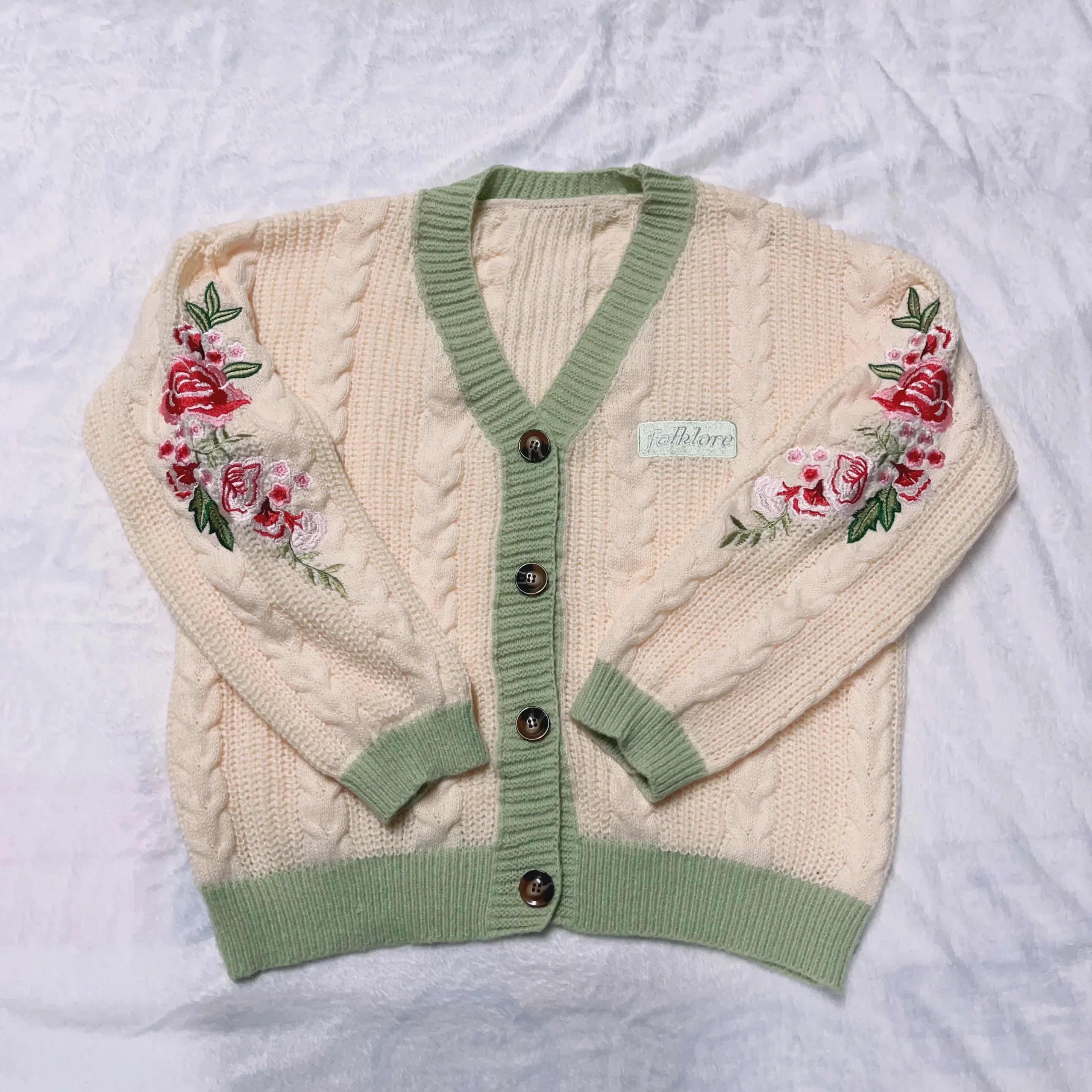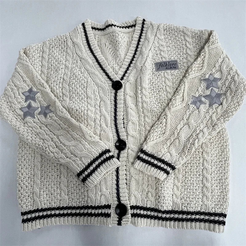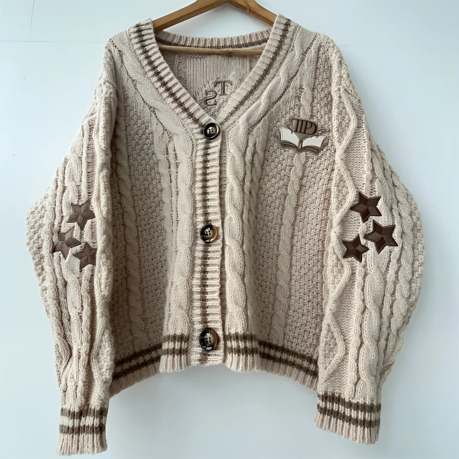 Dermearne Women Autumn Cotton Star Embroidery Khaki Knitted Cardigans V Neck Aesthetic Retro Single Breasted Sweaters Y2k Beige Tops