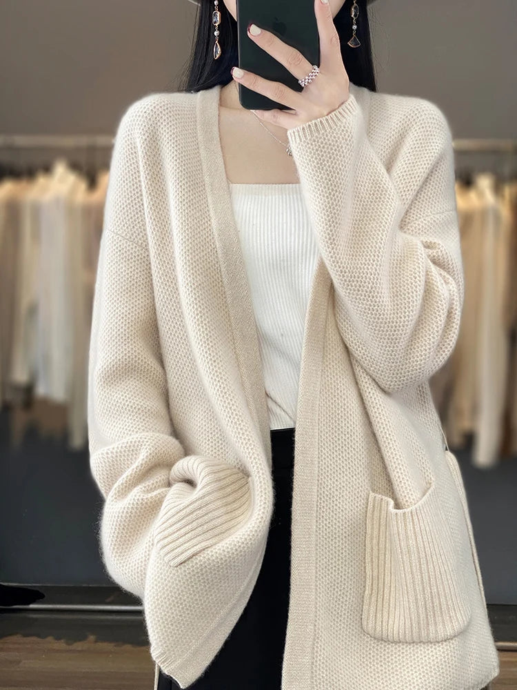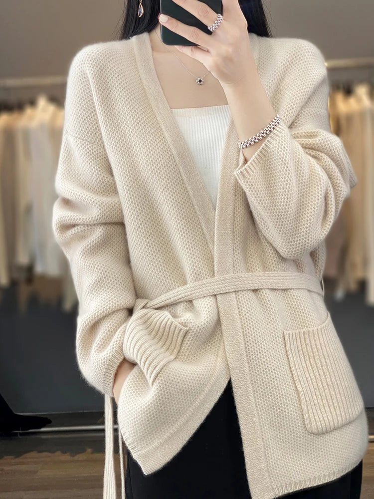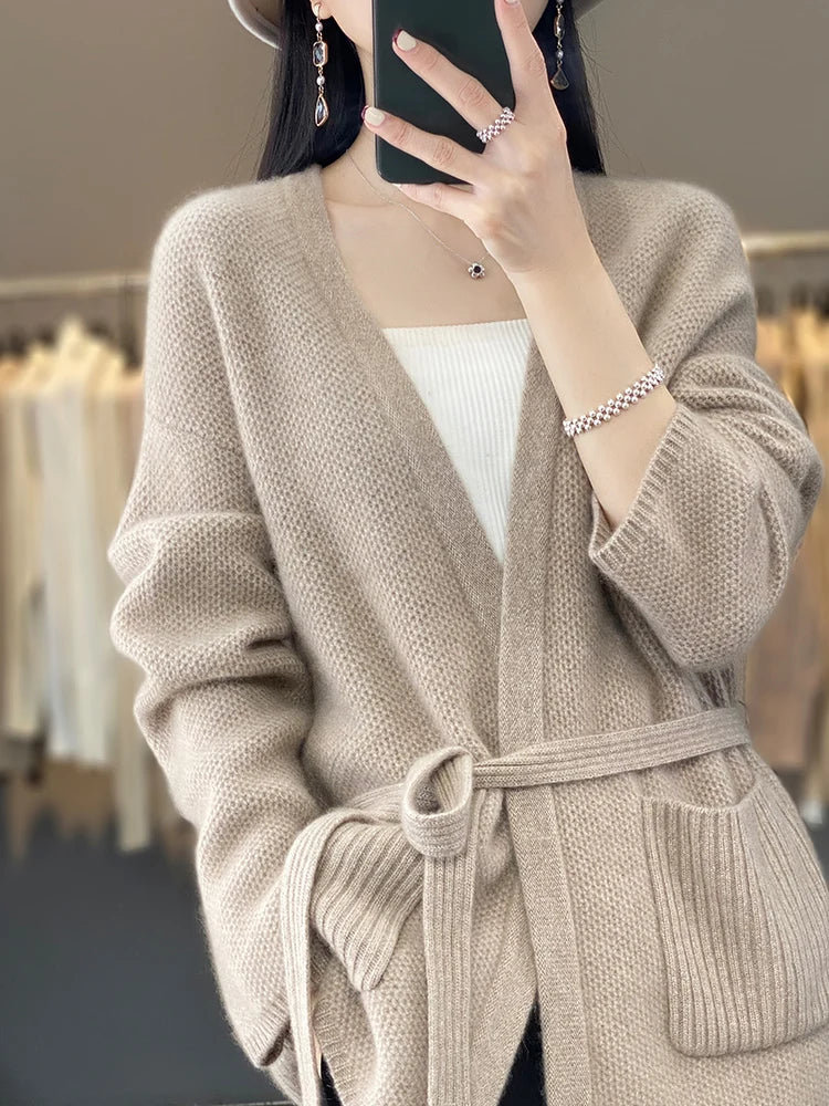 Women Cardigan V-neck Belt Solid 100% Merino Wool Sweater Soft Warm Autumn Winter Cashmere Knitwear Female Grace Clothing Tops