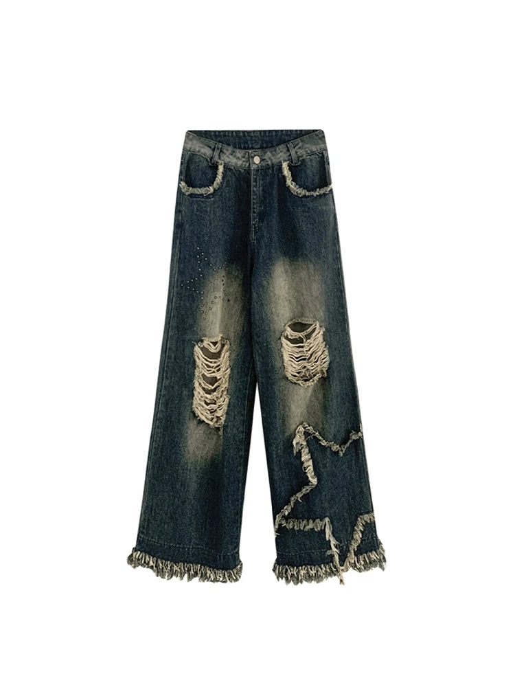 Women Dark Blue Y2k Ripped Jeans Baggy Harajuku Denim Trousers Vintage Star Jean Pants Japanese 2000s Style Trashy Clothes 2024