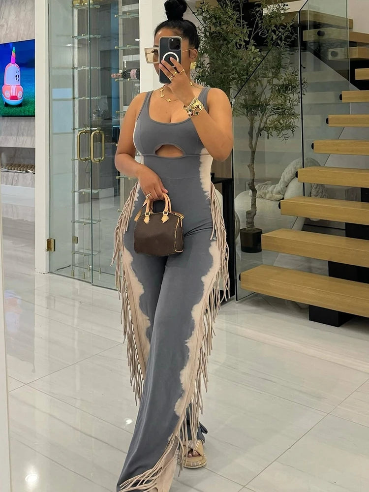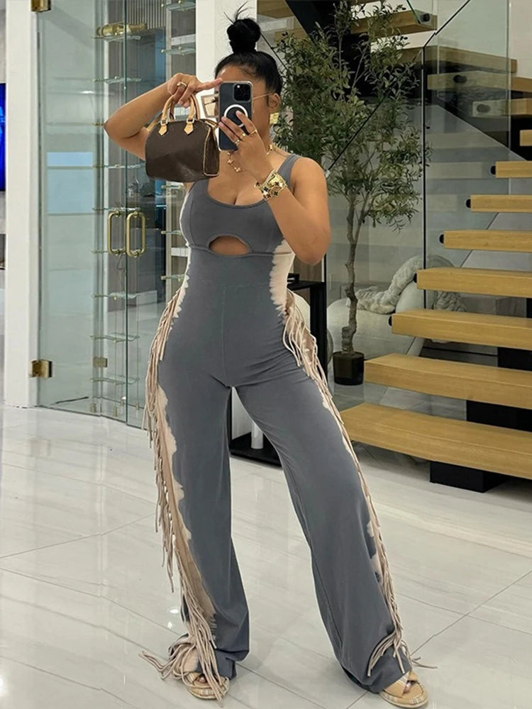 Womens High Street Strapless Jumpsuit with Tassel Summer Ladies Stretchy Jumpsuit Sleeveless Tank Collar Sexy Long Jumpsuits