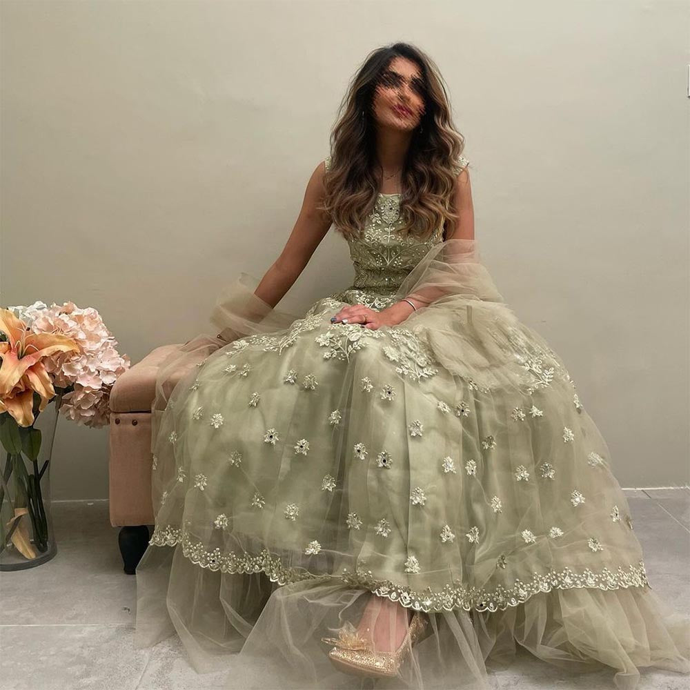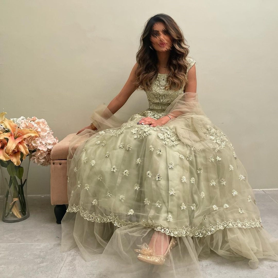 Xijun Dubai Lace Appliques Embroidery Flower Tulle Evening Dresses A-Line Pleat Ruched Saudi Arabic Women Formal Party Prom Gown