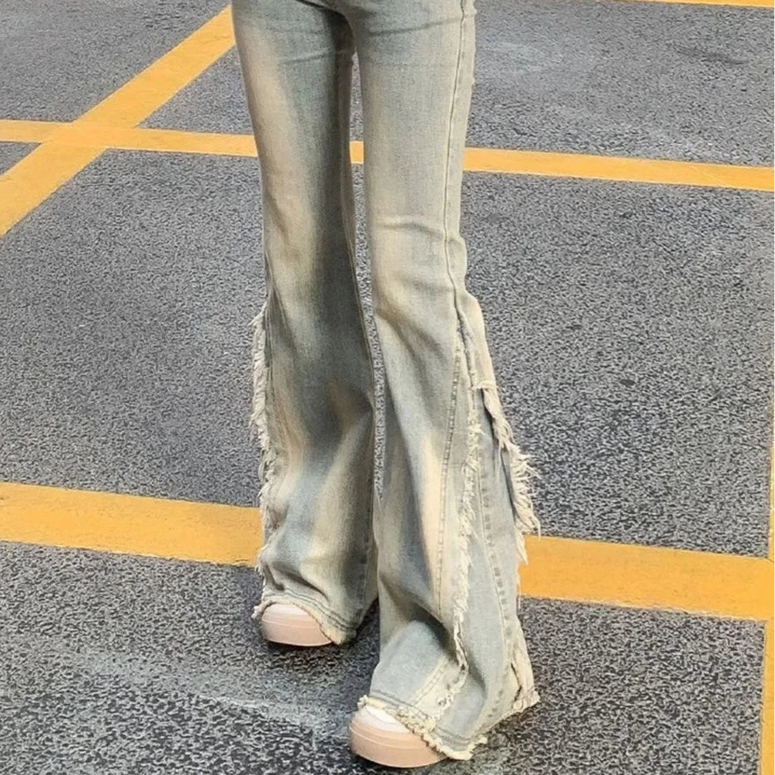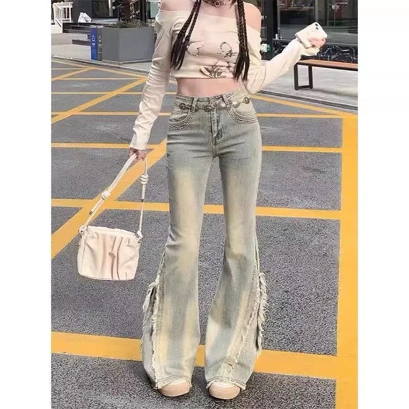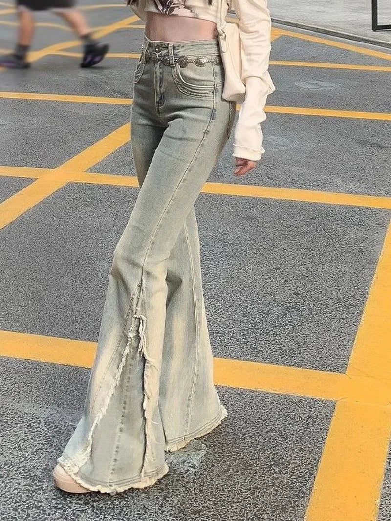 DERMEARNE Women Vintage Blue Jeans High Waist American Retro 90s Raw Material Edge Design Y2k Denim Pants Streetwear Wide Leg Jeans