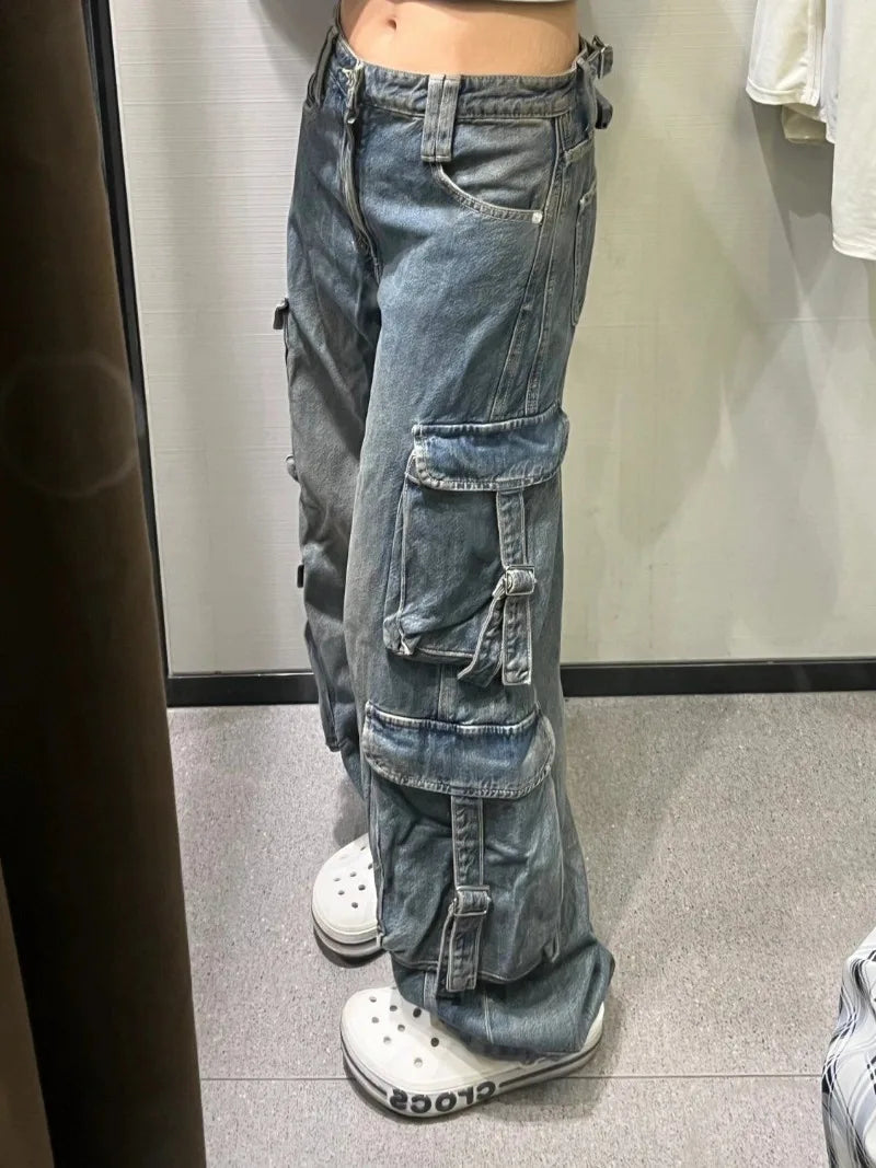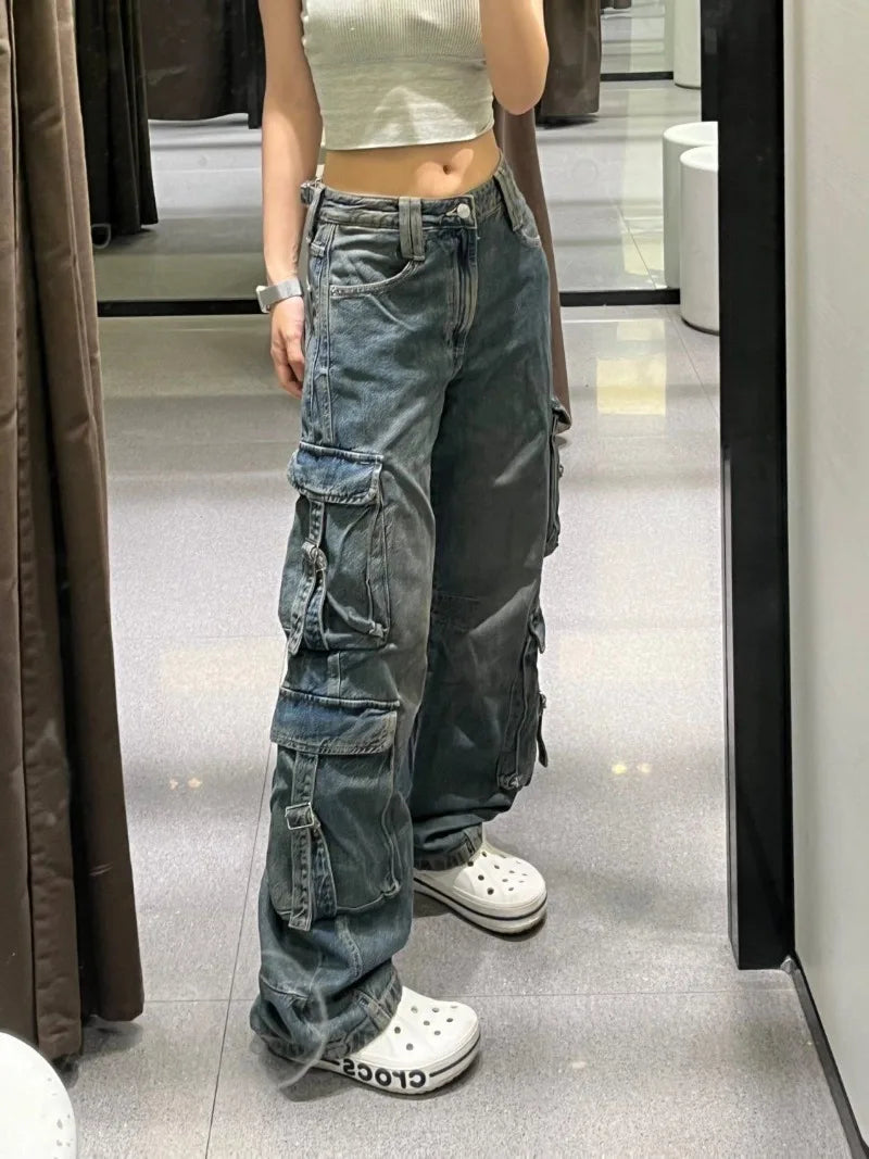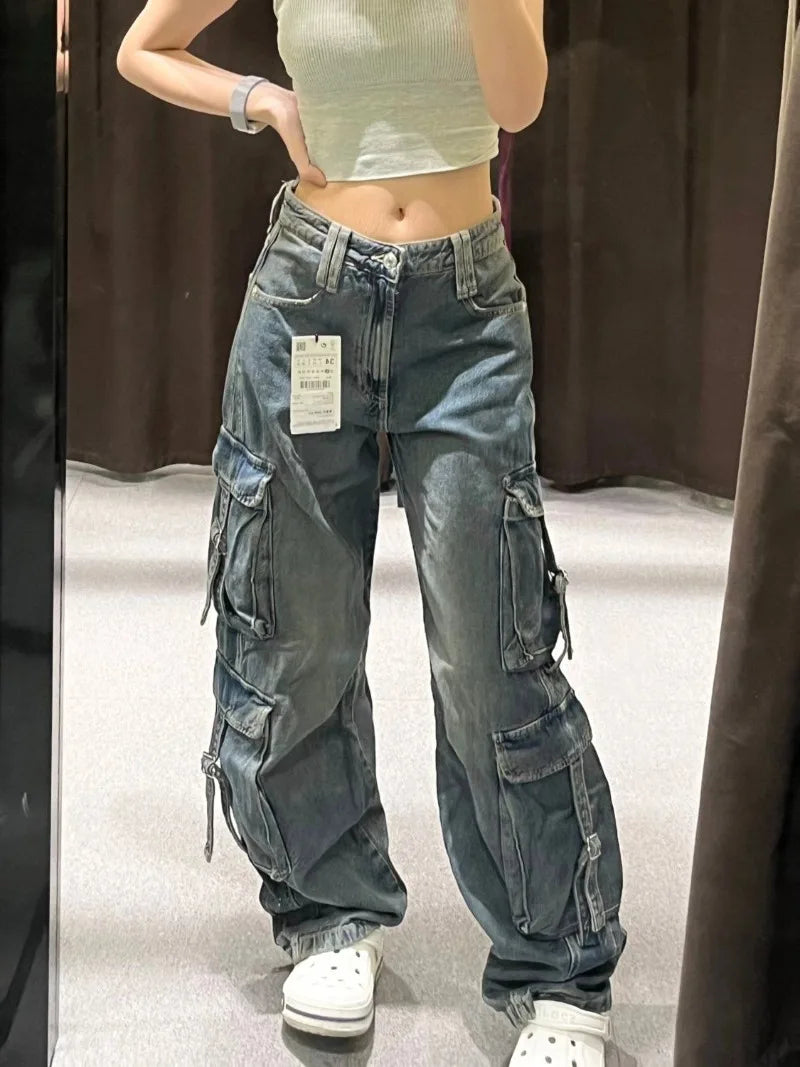 Dermearne Multi-pocket Design Streetwear Cargo Pants Women Autumn Winter Wide-leg Trendy Niche Washable Oversized Jeans Women Y2k Baggy