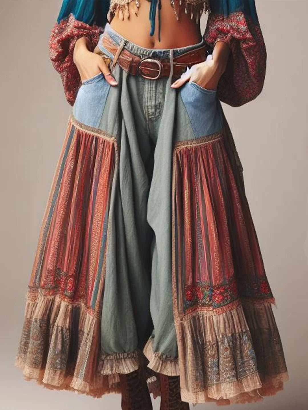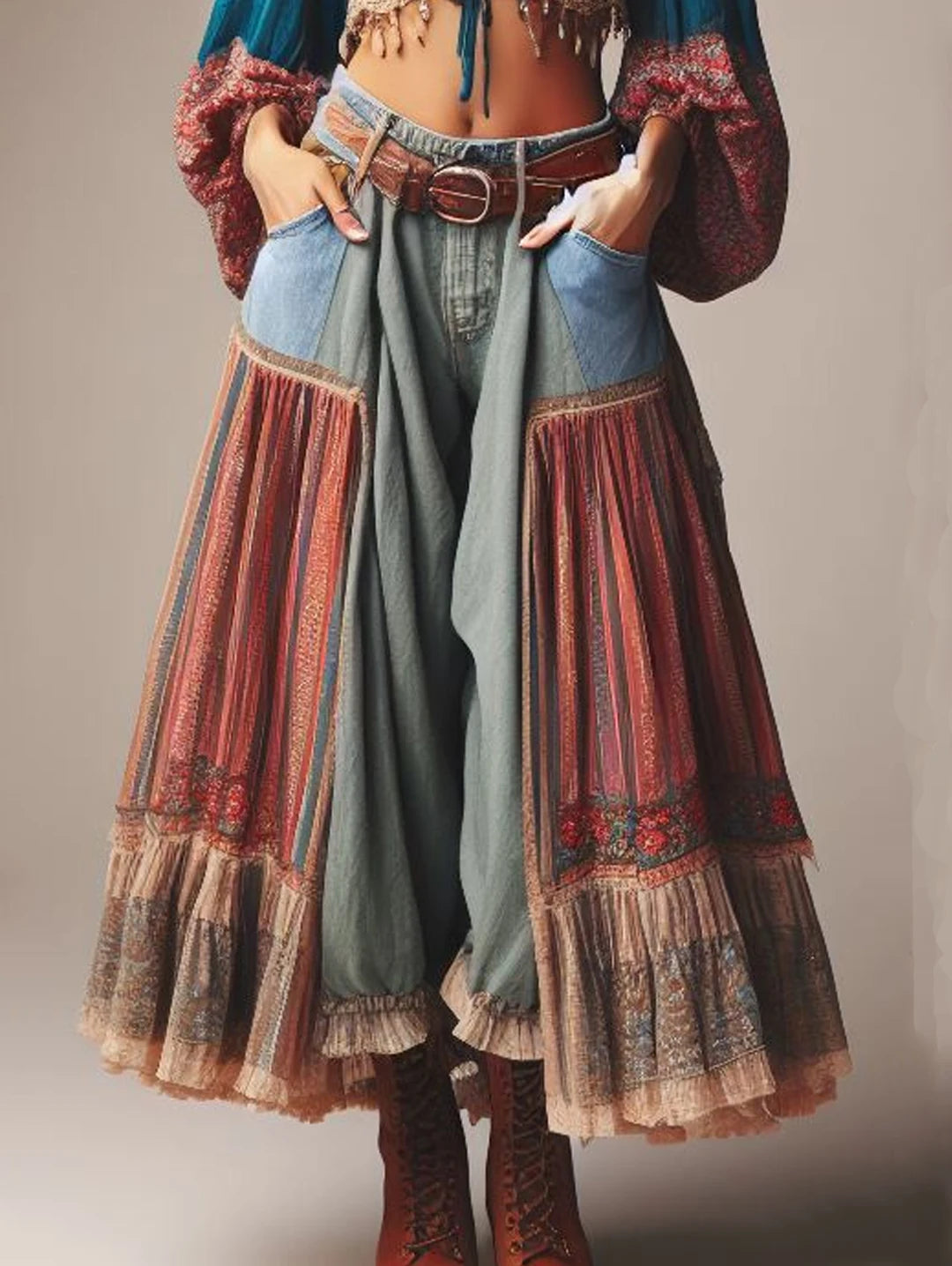 Dermearne Summer Autumn Pants for Women Bohemian Patchwork Wide Leg Pants Femme Arts Style Skirt Patch Casual Loose Pantalon